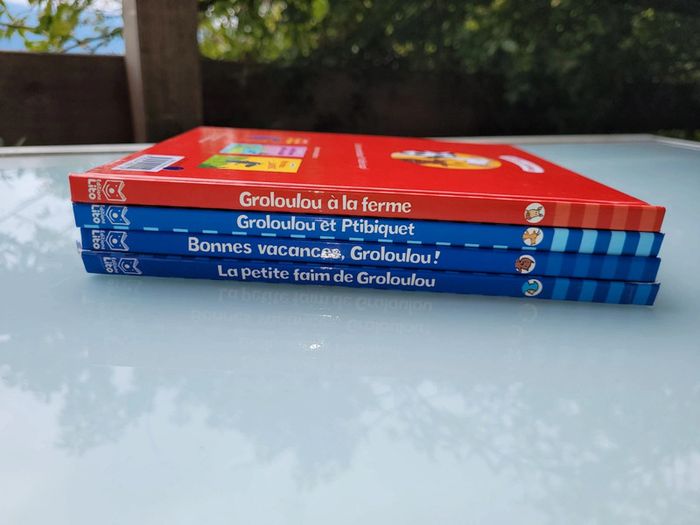 4 livres enfant de la série Groloulou : - Groloulou et Ptibiquet - Grouloulou à la ferme - La Petite faim de Groloulou - Bonnes vacances Groloulou ! En très bon état à part une tranche abîmée rescotchée (cf dernière photo) Pour voir mes autres livres enfants : #livreenfantmooglou