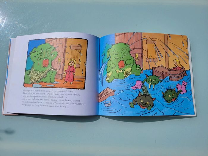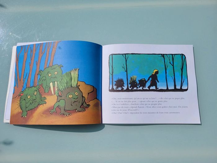 PIQUE, GRATTE ET GROGNE Le premier est couvert de piquants, le deuxième a des cheveux comme des crins, le troisième a de grosses dents pointues, et ils sont aussi menaçants l'un que l'autre. Leur grand plaisir, quand ils se promènent dans les recoins les plus sombres de la forêt, c'est de trouver une victime et de lui tomber dessus par surprise, du haut d'un arbre, afin de lui causer la peur de sa vie. Mais avec la petite Aurore, Pique, Gratte et Grogne tombent plutôt mal, car elle n'a pas peur de grand-chose. Et c'est avec un grand sourire qu'elle les invite à goûter chez elle... à condition qu'ils se comportent de manière civilisée. Chez Aurore, il faut s'essuyer soigneusement les pieds sur le paillasson avant d'entrer, mais dans la cuisine, il y a des montagnes de crêpes, de brioches et de tartines, et les trois monstres ne songent vraiment plus à effrayer qui que ce soit. Ils sont devenus si dociles que lorsque Aurore les débarbouille et les coiffe avant de leur donner à chacun un joli pyjama, ils se laissent faire sans broncher. Mais au milieu de la nuit, quelqu'un frappe à la porte, si fort que toute la maison en tremble. C'est la maman monstre qui cherche partout ses petits, et risque de ne pas tellement apprécier la transformation... Dimensions‎ 23.2 x 1 x 27.5 cm Format Broché à 19.22€ sur amazon Livre en bon état Pour voir mes autres livres enfants : #livreenfantmooglou