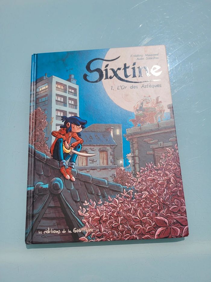 BD ÉDITIONS DE LA GOUTTIÈRE SIXTINE TOME 1 : L'OR DES AZTÈQUES Depuis la disparition de son père, Sixtine vit seule avec sa maman... et trois pirates fantomatiques qui veillent sur elle ! La collégienne est tiraillée entre l'envie de savoir d'où elle vient et la peur de blesser sa mère qui fait face à des soucis financiers. Le jour où la classe de Sixtine se rend au musée pour admirer le trésor des Aztèques, la jeune fille et ses acolytes montent un plan quelque peu risqué... Relié 80 pages Format 22,50 x 29,80 x 1,30 cm Très bon état (juste un prenom ecrit sur la page de garde Mes autres BD : #bdmooglou #livreenfantmooglou #livreadomooglou