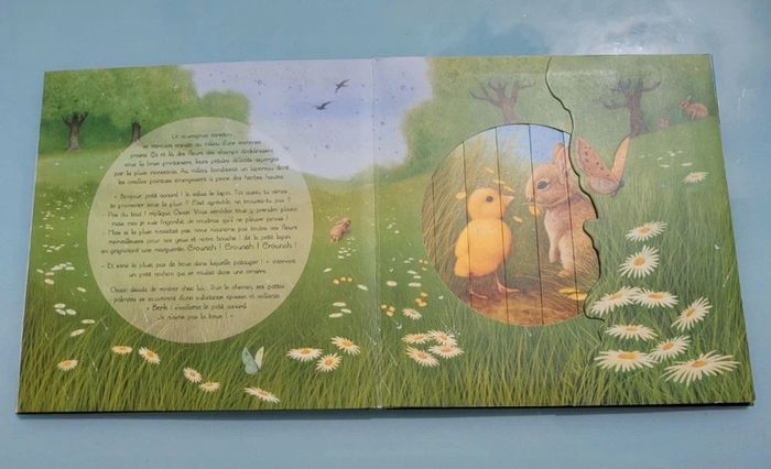 IL PLEUT PETIT CANARD Oscar, le petit canard vient de sortir de sa coquille. Curieux de découvrir le monde, il part en excursion à travers la ferme... mais la pluie se met à tomber. Cela va-t-il tout gâcher ? Tu le sauras en découvrant ses aventures dans ce livre animé de fenêtres magiques. Une histoire tendrement illustrée à raconter le soir au moment du coucher. Éditeur‎ : Quatre Fleuves Cartonné‎ 14 pages Dimensions‎ : 26.3 x 3 x 26.3 cm En très bon état #quatrefleuvesmooglou Pour voir mes autres livres enfant : #livreenfantmooglou