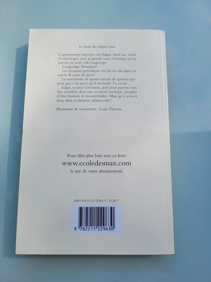 L'appartement biscornu où Edgar, neuf ans, vient d'emménager avec sa grande soeur Geronima et ses parents est resté vide longtemps. Longtemps. Pourquoi ? Les locataires précédents ont fui les uns après les autres. À cause de quoi ? La marchande de quatre-saisons du quartier prétend que c'est parce qu'il est hanté. Va savoir… Edgar, sa soeur Geronima, puis leurs parents vont être entraînés dans une aventure loufoque, peuplée d'êtres bizarres et incontrôlables. mais qu'y avait-il donc dans ce fameux cabinet noir ? De 8 à 11 ans. En très bon état Je vends beaucoup d'autres livres de l'école des loisirs : #lecoledesloisirsmooglou Pour voir mes autres livres enfants : #livreenfantmooglou