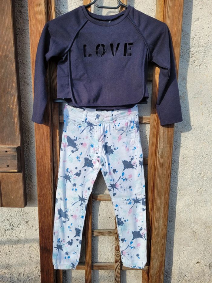 - un sweat court marine, Love découpé sur la poitrine, genre de "soufflets" sur les cotés, bien porté, légèrement bouloché, taille 6 ans