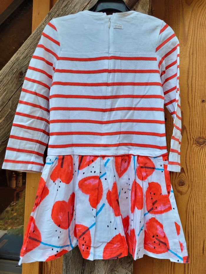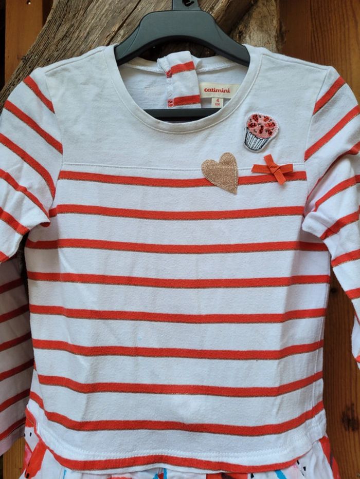 Superbe robe manches longues de la marque Catimini, blanche à rayures rouges et dorées en haut et fleurs rouges pour la jupe Taille 4 ans Bien portée mais encore en bon état