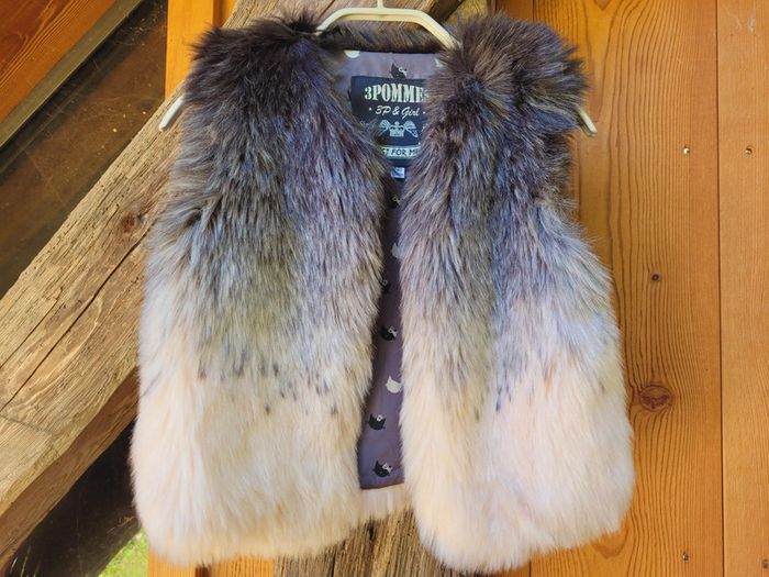 Superbe veste sans manche de la marque 3 Pommes, toute douce en poils, dégradé du gris foncé au rose clair en passant part le gris clair, doublure tissu satin motifs chats, 4 ans, très bon état Pour voir mes autres vêtements 4 ans : #4ansfillemooglou