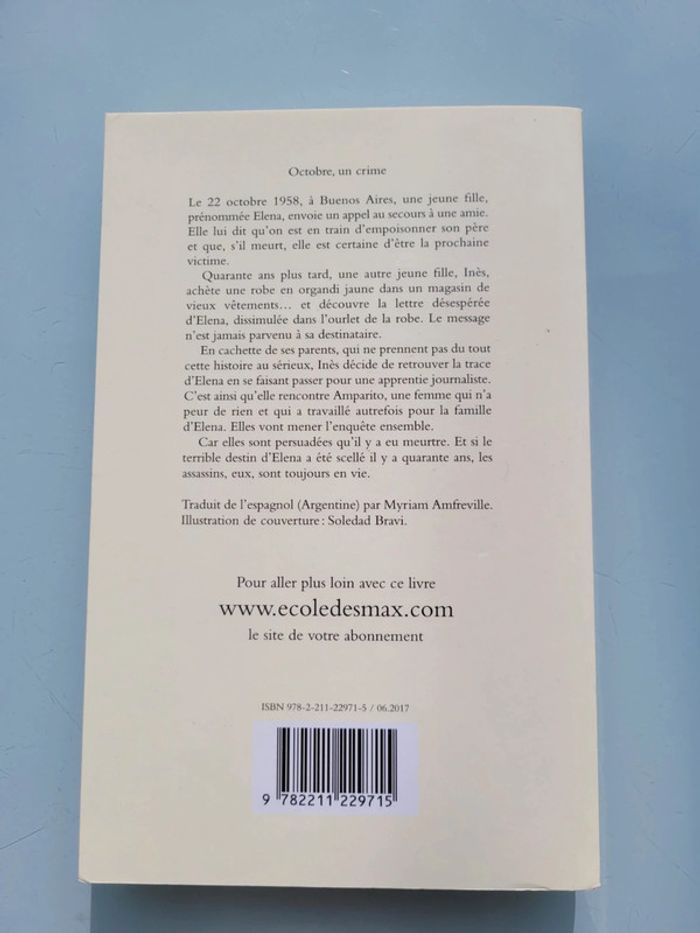 OCTOBRE, UN CRIME Le 22 octobre 1958, à Buenos Aires, une jeune fille, prénommée Elena, envoie un appel au secours à une amie. Elle lui dit qu’on est en train d’empoisonner son père et que, s’il meurt, elle est certaine d’être la prochaine victime. Quarante ans plus tard, une autre jeune fille, Inès, achète une robe en organdi jaune dans un magasin de vieux vêtements… et découvre la lettre désespérée d’Elena, dissimulée dans l’ourlet de la robe. Le message n’est jamais parvenu à sa destinataire. En cachette de ses parents, qui ne prennent pas du tout cette histoire au sérieux, Inès décide de retrouver la trace d’Elena en se faisant passer pour une apprentie journaliste. C’est ainsi qu’elle rencontre Amparito, une femme qui n’a peur de rien et qui a travaillé autrefois pour la famille d’Elena. Elles vont mener l’enquête ensemble. Car elles sont persuadées qu’il y a eu meurtre. Et si le terrible destin d’Elena a été scellé il y a quarante ans, les assassins, eux, sont toujours en vie. En très bon état, couverture de devant légèrement abîmée Pour voir mes autres livres enfants : #livreenfantmooglou #lecoledesloisirsmooglou