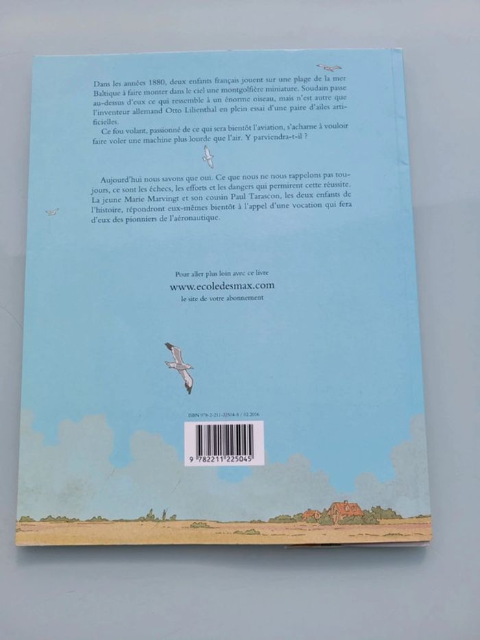 LILIENTHAL, LE FOU VOLANT Paul est venu passer les grandes vacances 1891 chez sa cousine Marie, au bord de la mer Baltique. Leur passion commune ? Fabriquer des cerfs-volants, et les envoyer dans le ciel. Cet été-là, ils ont même construit une montgolfière miniature pour leurs poupées, mais peinent à la faire voler… quand, soudain, une créature bizarre, un oiseau géant, passe en planant au-dessus d’eux. Intrigués, ils le suivent et tombent sur… un homme. C’est Otto Lilienthal, un savant génial. Il va partager avec eux ses secrets, au point de faire d’eux des pionniers de l’aéronautique, Marie Marvingt et Paul Tarascon. Prix du neuf: 12.70€ Nombre de pages 48 Format : 22,50 x 28,70 x 0,90 cm Livre en très bon état Pour voir mes autres livres enfants : #livreenfantmooglou