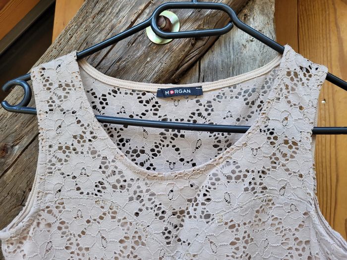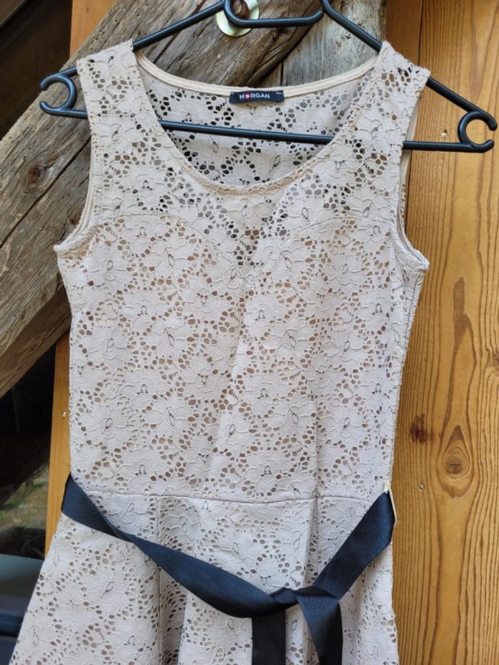 Superbe robe de la marque Morgan, dentelle couleur beige/taupe, sans manche, taille cintrée, ceinture tissu noire, taille 14/16 ans, très bon état Pour voir mes autres articles en 14 ans : #14ansfillemooglou #16ansfillemooglou #morganmooglou