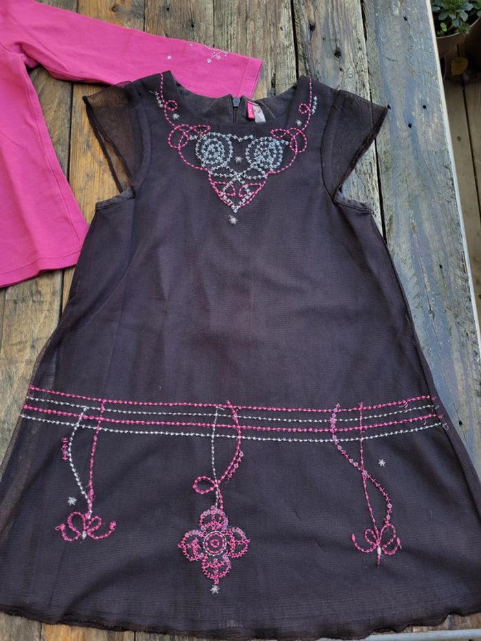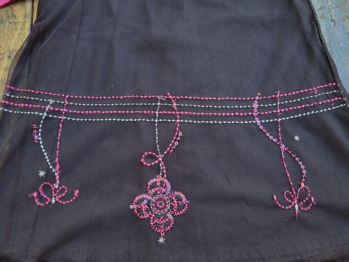 - 1 robe noire recouverte d'un tulle, broderies fuchsia arabesques et fleurs