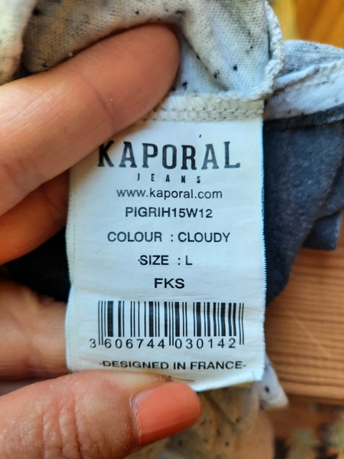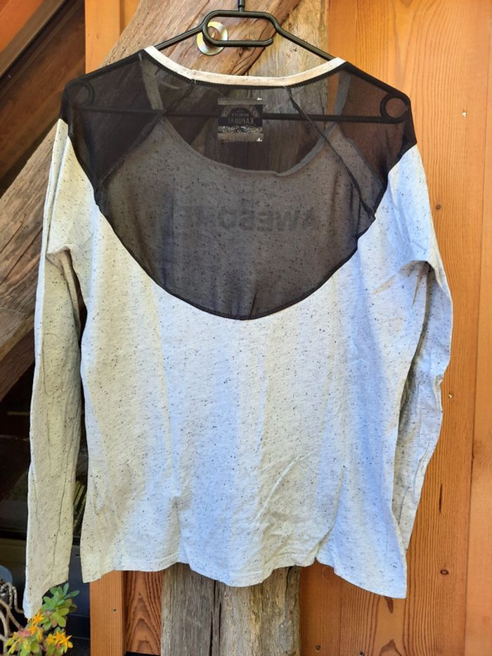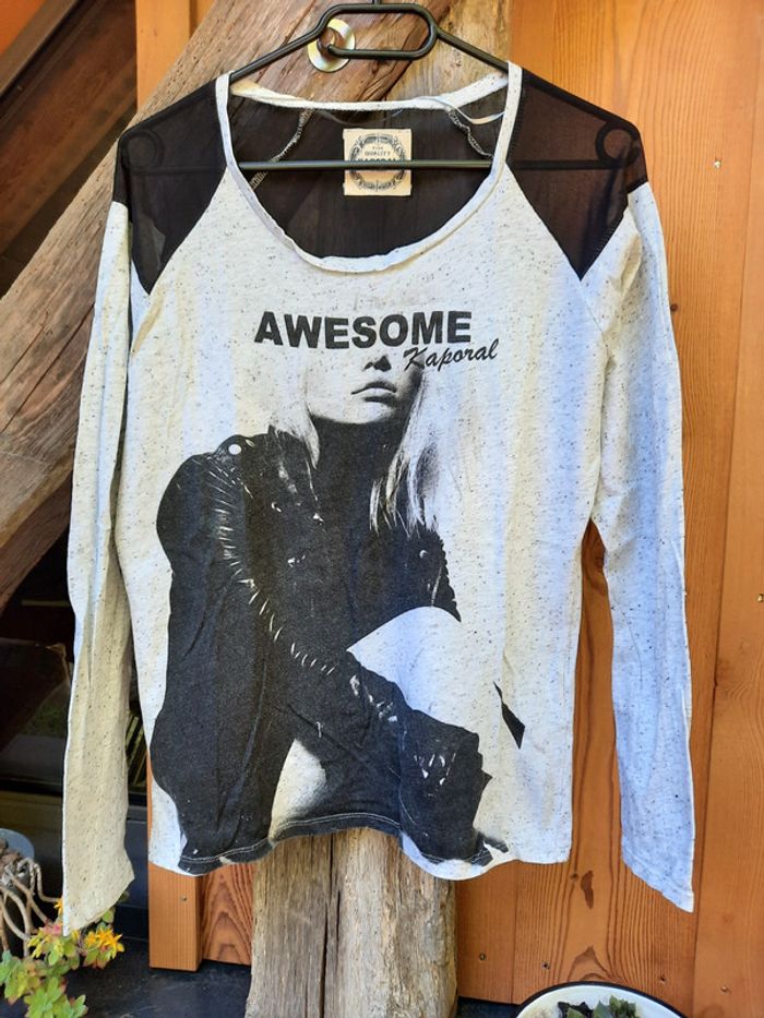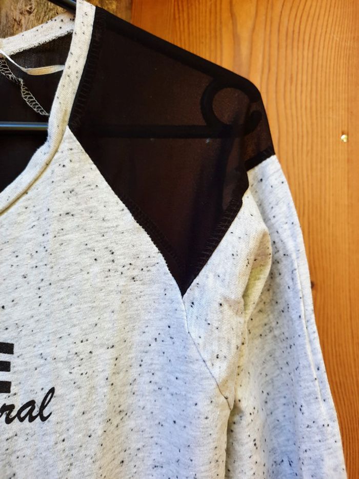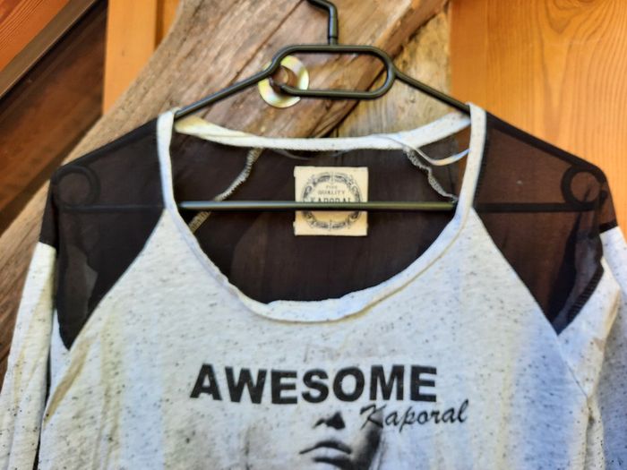 Superbe haut manches longues de la marque Kaporal, gris clair moucheté noir, voile noir transparent taille L, très bon état