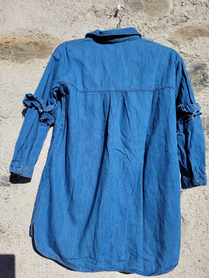 Très jolie robe chemise en jeans de la marque Zara girls, froufrous aux manches, étoiles en perles cousues 9 ans en très bon état Pour voir mes autres ventes en 10 ans : #10ansfillemooglou #zaramooglou