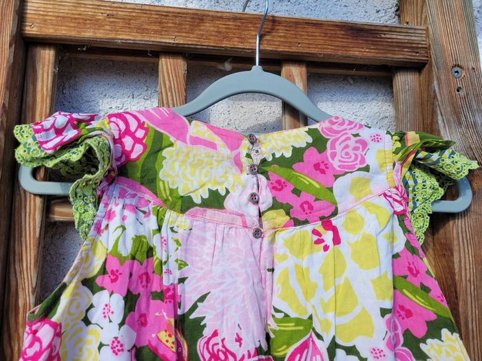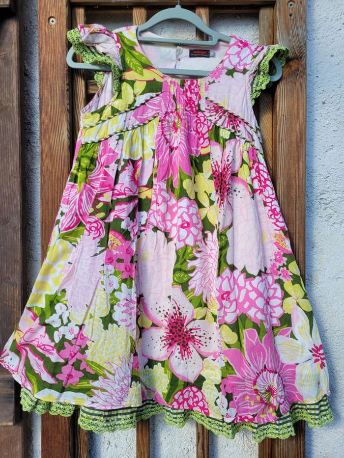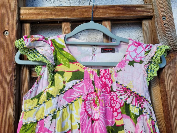 Superbe robe de la marque Catimini, colorée, tons roses, verts et jaunes, fleurs, sans manches, volants, 10 ans, très bon état Pour voir mes autres ventes en 10 ans : #10ansfillemooglou #catiminimooglou