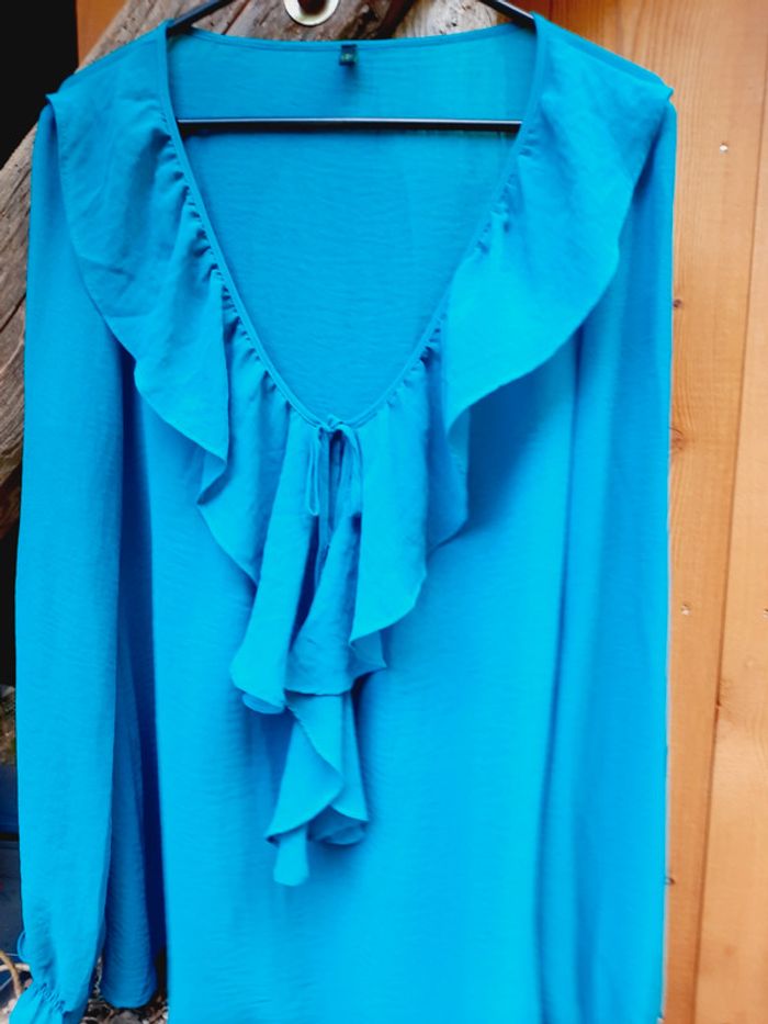 Superbe chemiede la marque Benetton, grand col V, bordé d'un volant, cintré aux poignets, taille L, très bon état #tailleLfemmemooglou #42femmemooglou
