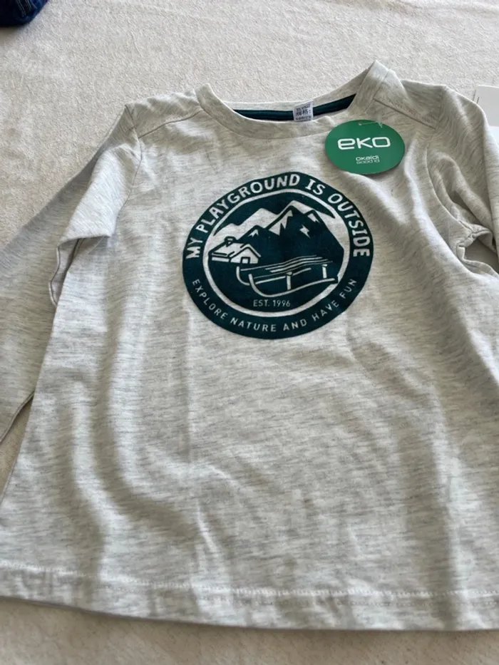 🤩 Pour confectionner un lot et ainsi optimiser vos frais, Utilisez #melanie85150 pour trier selon vos critères (marques, taille…).🌈 #melanie85150a3g Tee shirt okaidi 3 ans neuf avec étiquette Manches longues gris, chiné avec velours, vert, motif chalet et luge