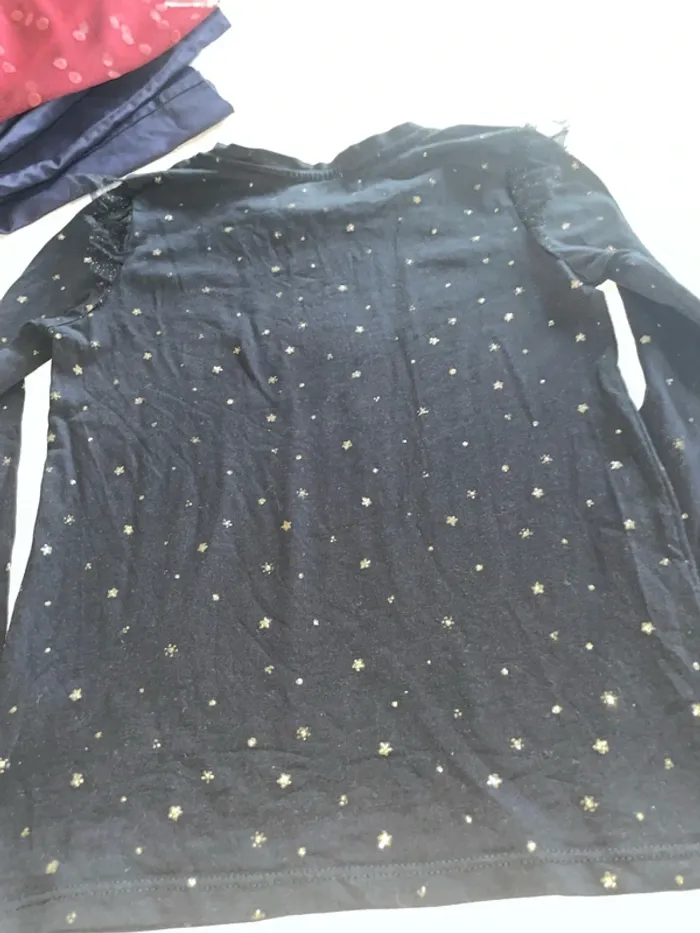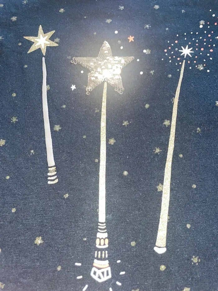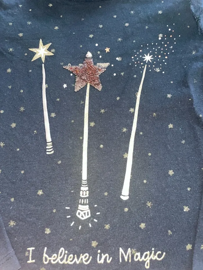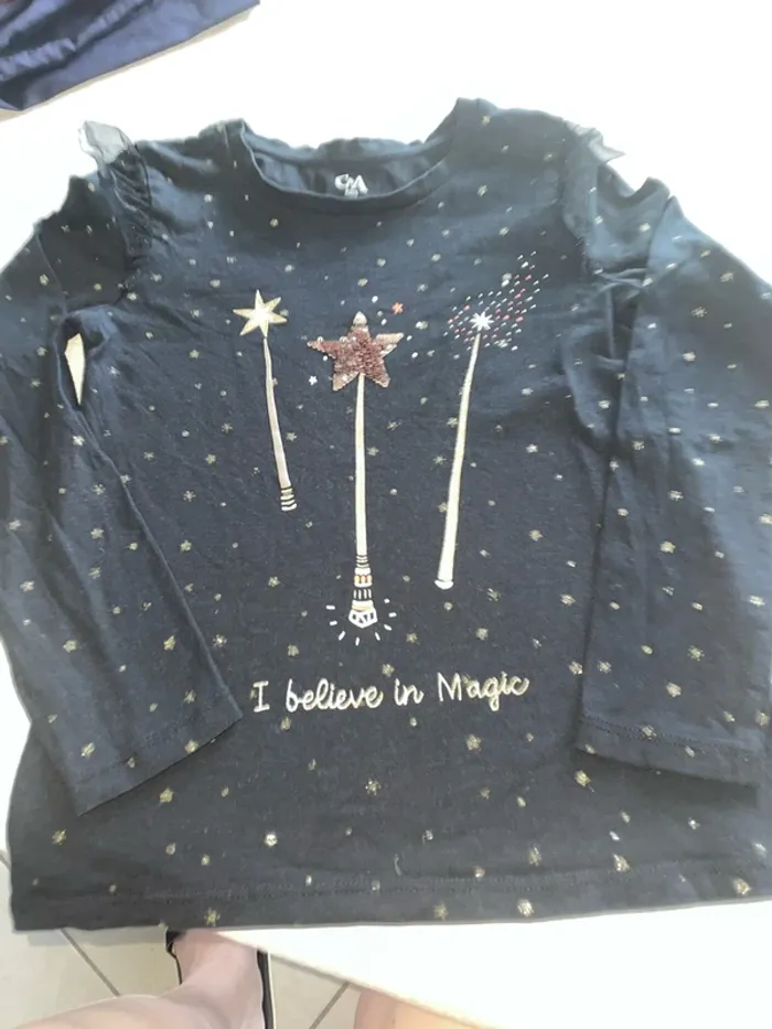 🤩 Pour confectionner un lot et ainsi optimiser vos frais, Utilisez #melanie85150 pour trier selon vos critères (marques, taille…).🌈 #melanie85150a8f T-shirt C&A huit ans Excellent état Manches longues avec du Noir avec des touches de doré, trois baguettes magiques dans une en sequins réversibles