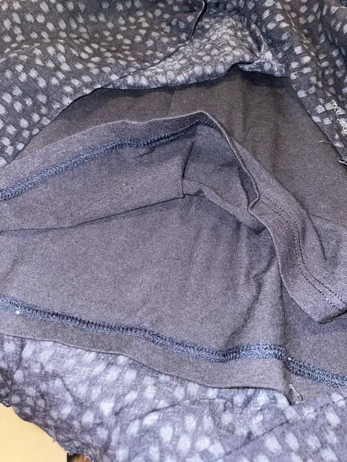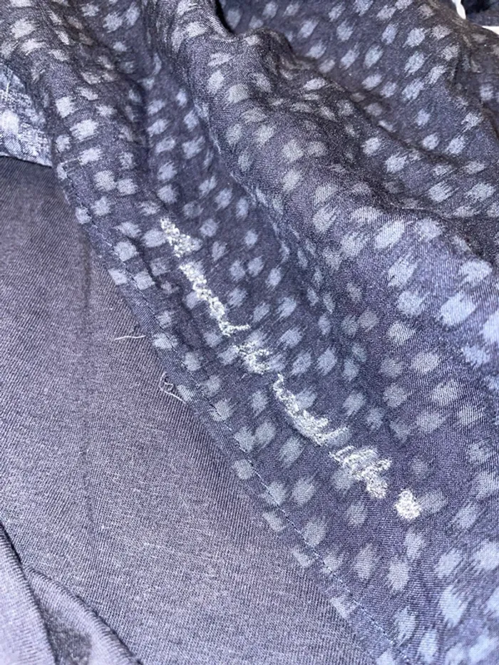 Écriture au fil argenté sur le bas qui est plus ample que la partie haute
