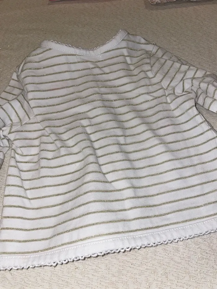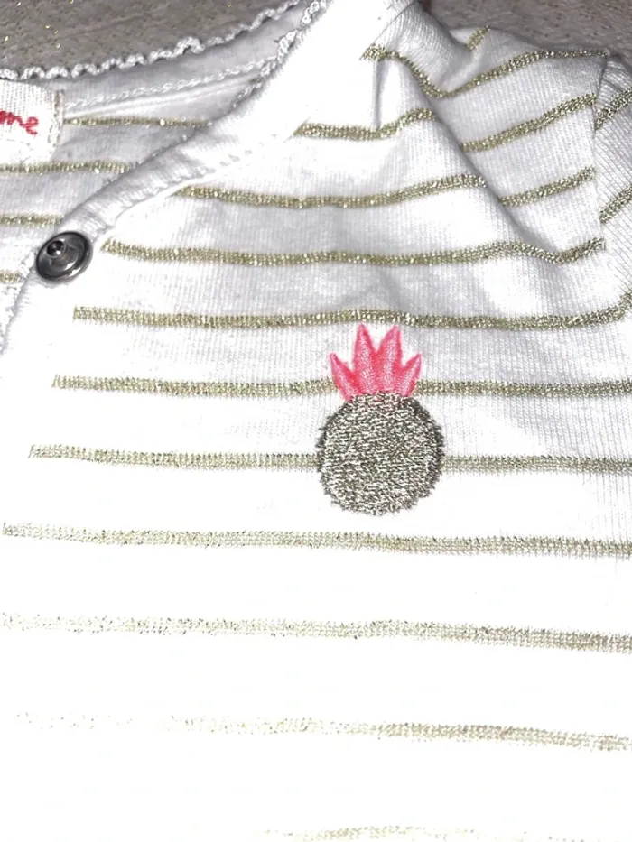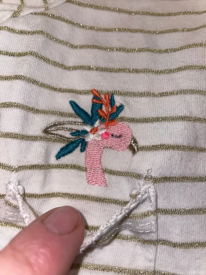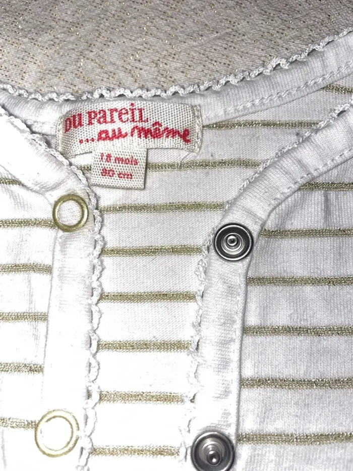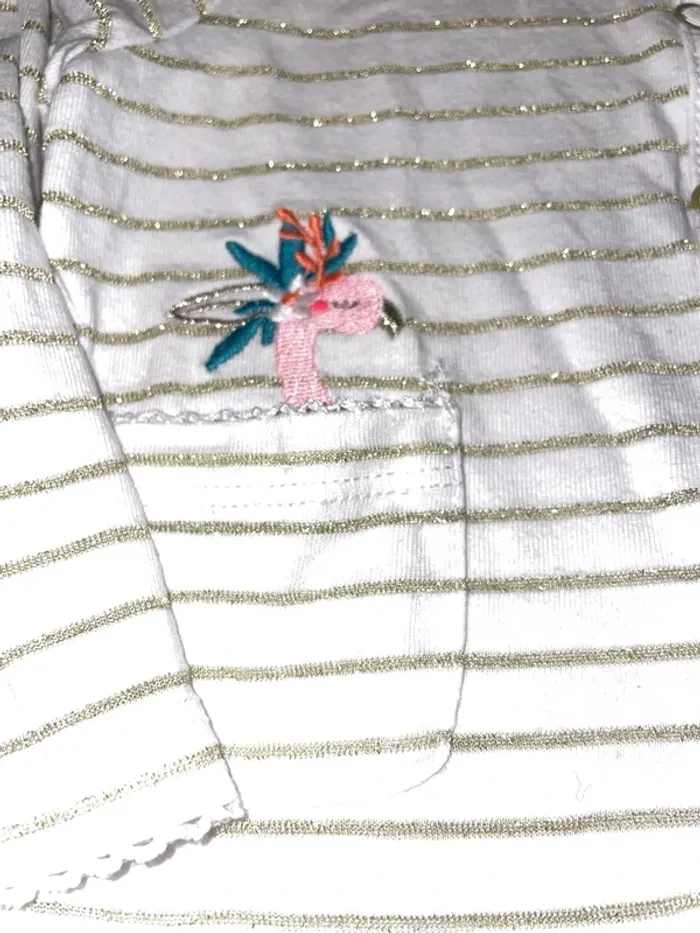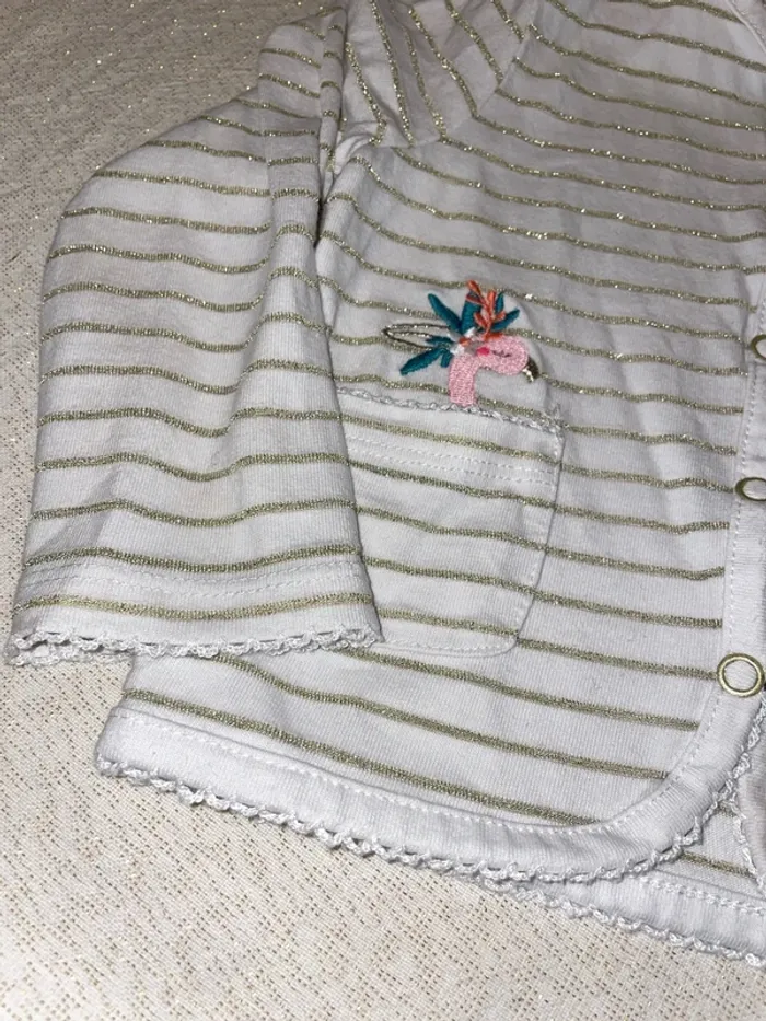 🤩 Pour confectionner un lot et ainsi optimiser vos frais, Utilisez #melanie85150 pour trier selon vos critères (marques, taille…).🌈 #melanie85150a2f #melanie85150f18m Gilet du pareil, même 18 mois Excellent état Blanc à rayures dorées pailletées Fermeture pressions liseré, broderie, vague sur tous les contours Broderie flamant rose au-dessus de la poche et ananas Également disponible Robe assortie