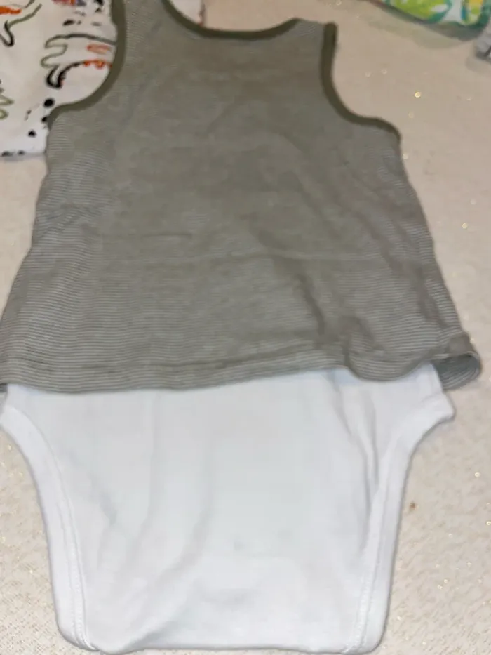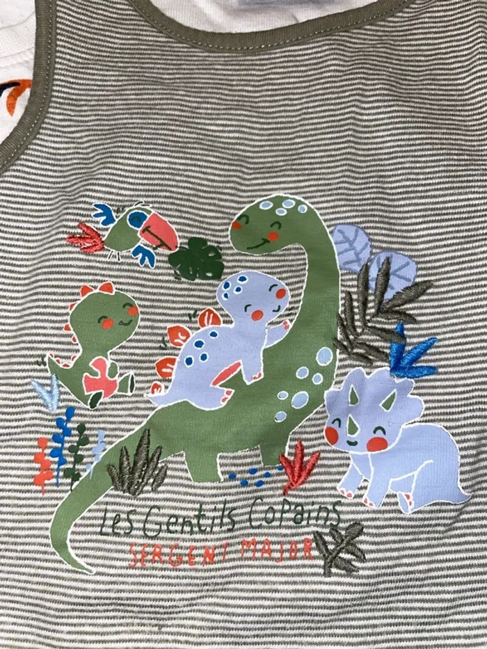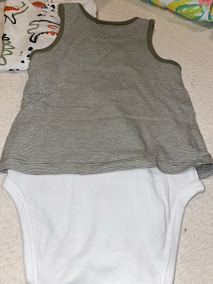 🤩 Pour confectionner un lot et ainsi optimiser vos frais, Utilisez #melanie85150 pour trier selon vos critères (marques, taille…).🌈 #melanie85150g12m Body avec tee shirt intégré blanc et kaki avec dino 🦖 🦕 les gentils copains
