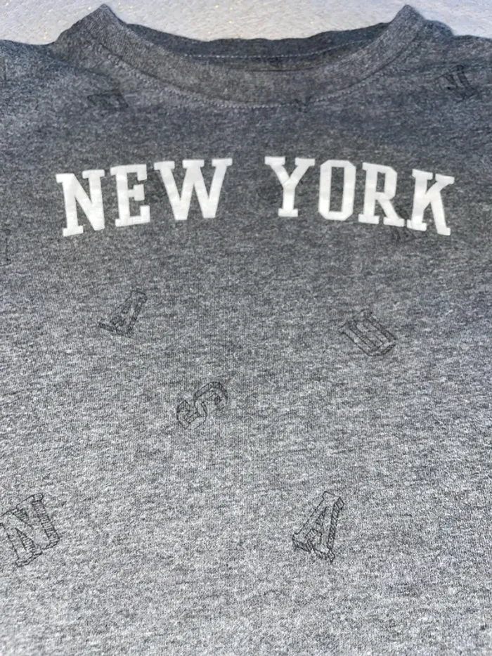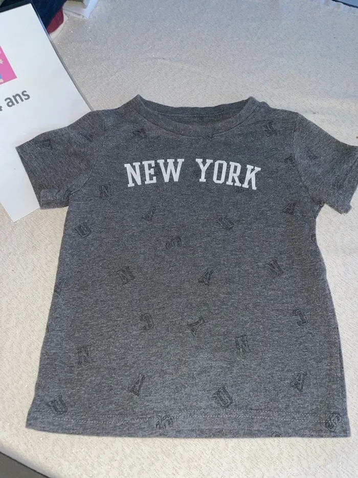 🤩 Pour confectionner un lot et ainsi optimiser vos frais, Utilisez #melanie85150 pour trier selon vos critères (marques, taille…).🌈 #melanie85150a4g T-shirt Kiabi, quatre ans Manches courtes Gris avec lettres gris foncé Écriture New York, en blanc