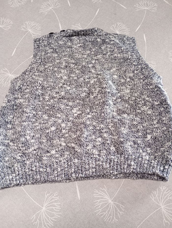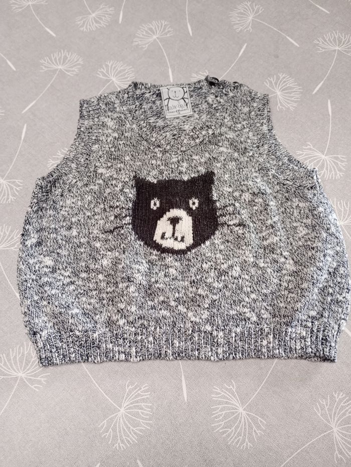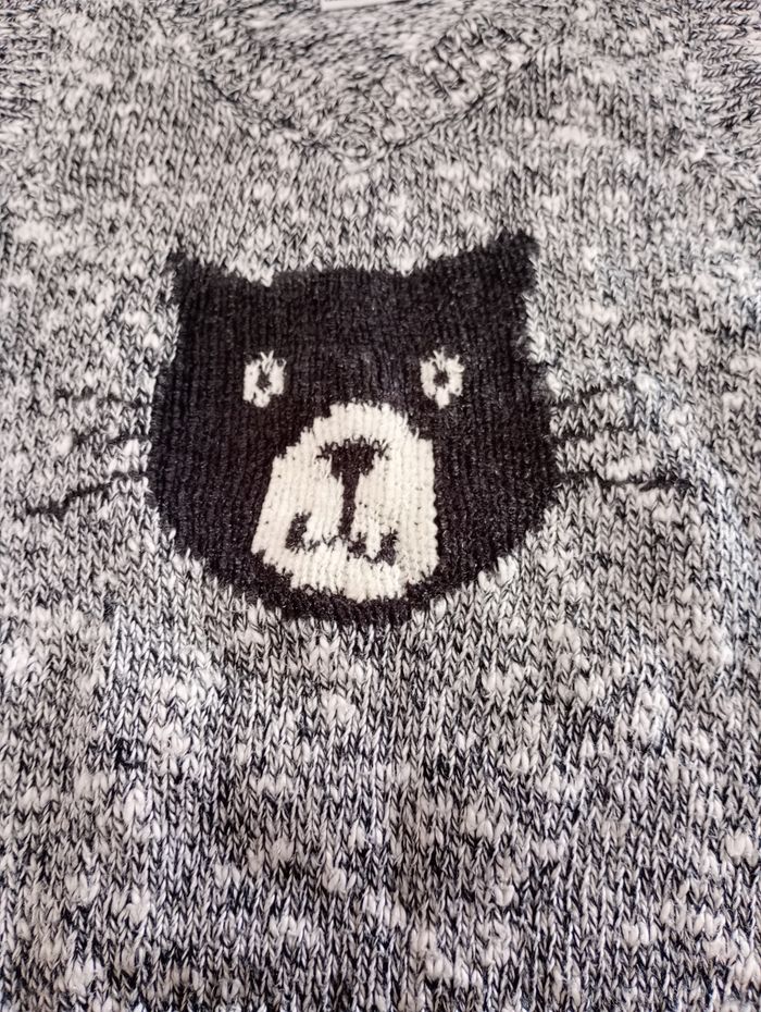 Pull sans manches, gris chiné avec chat. Taille : 74. Marque : H&M. Très bon état. Bac 29