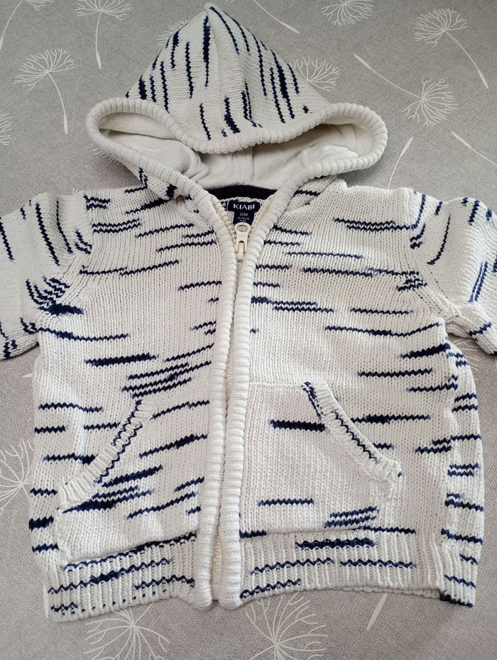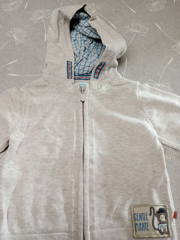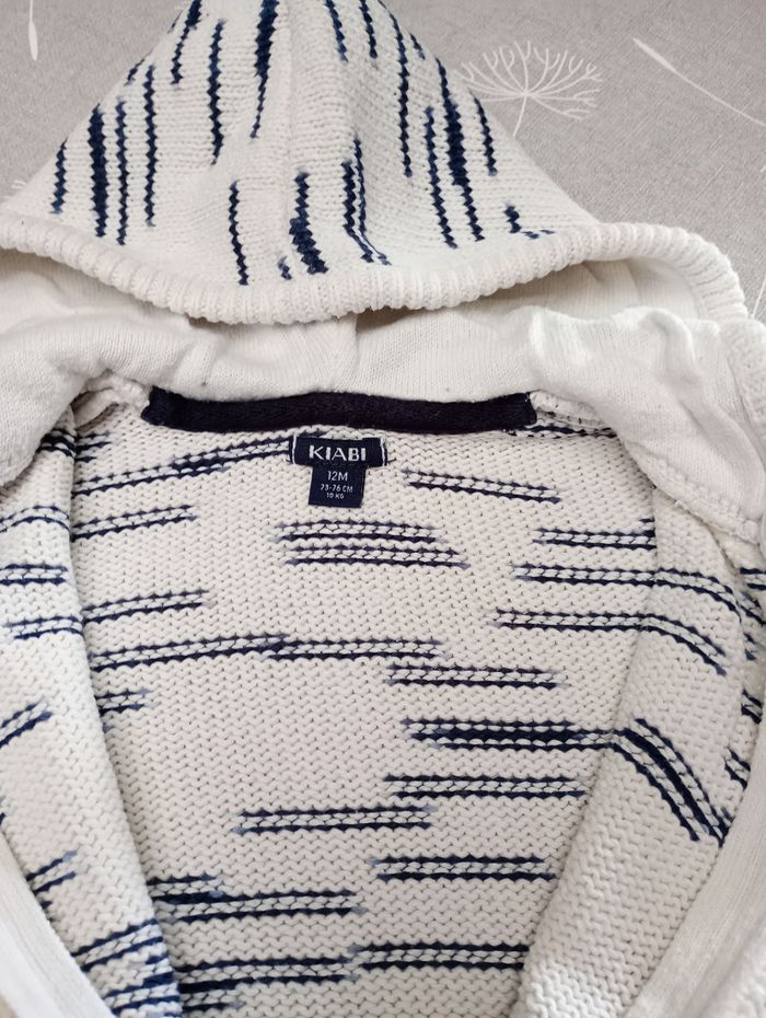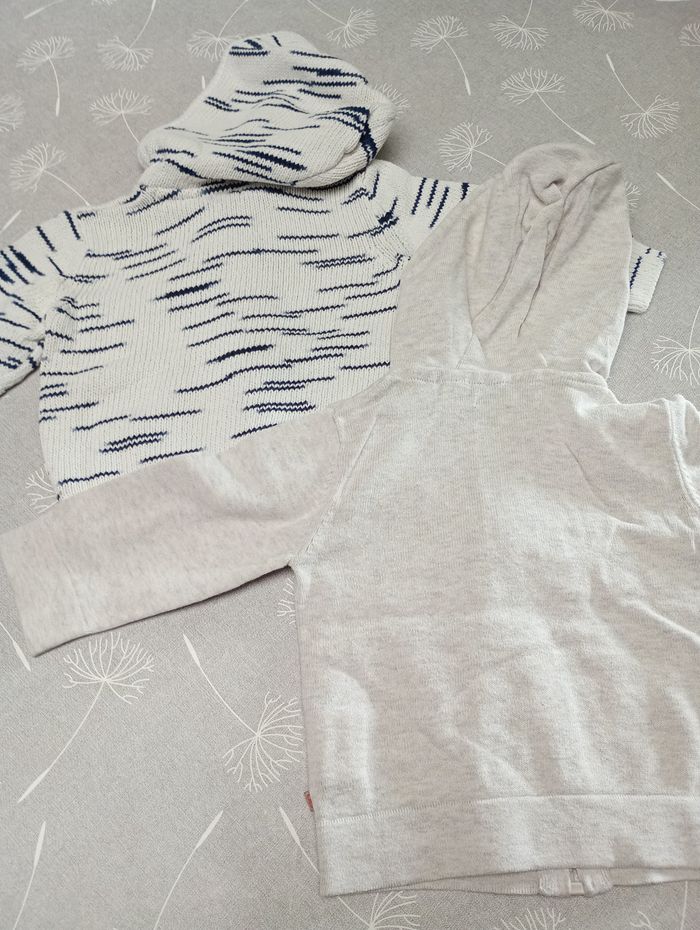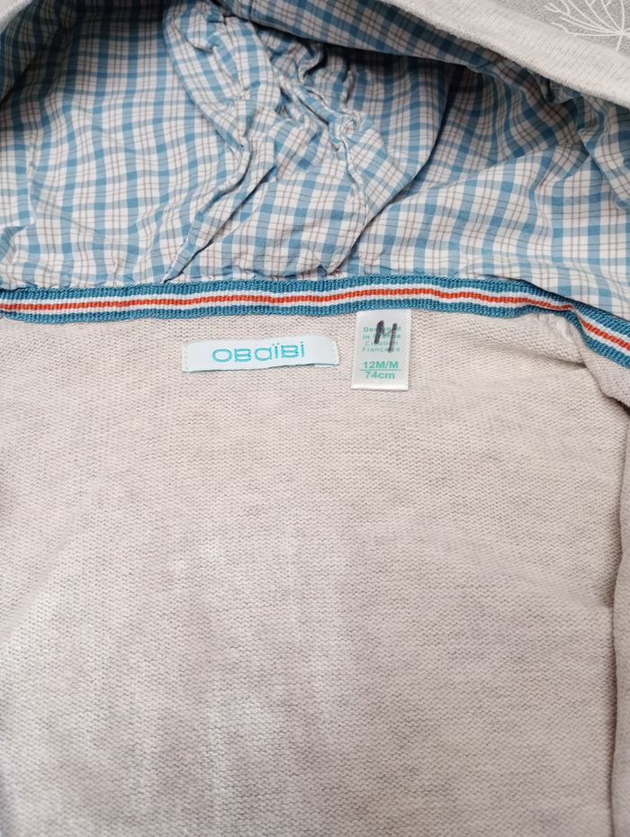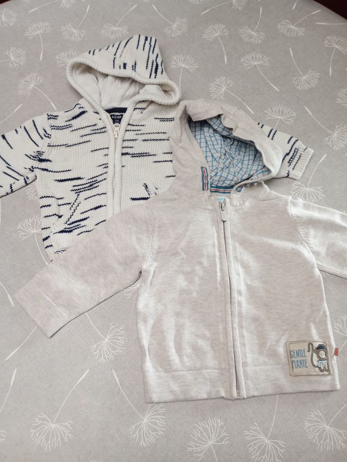 Lot de 2 gilets à capuche. Beige : Taille : 12 mois, 74, marque Obaïbi. Ligné : Taille : 12 mois, 73-76, marque Kiabi. Très bon état. Bac 29