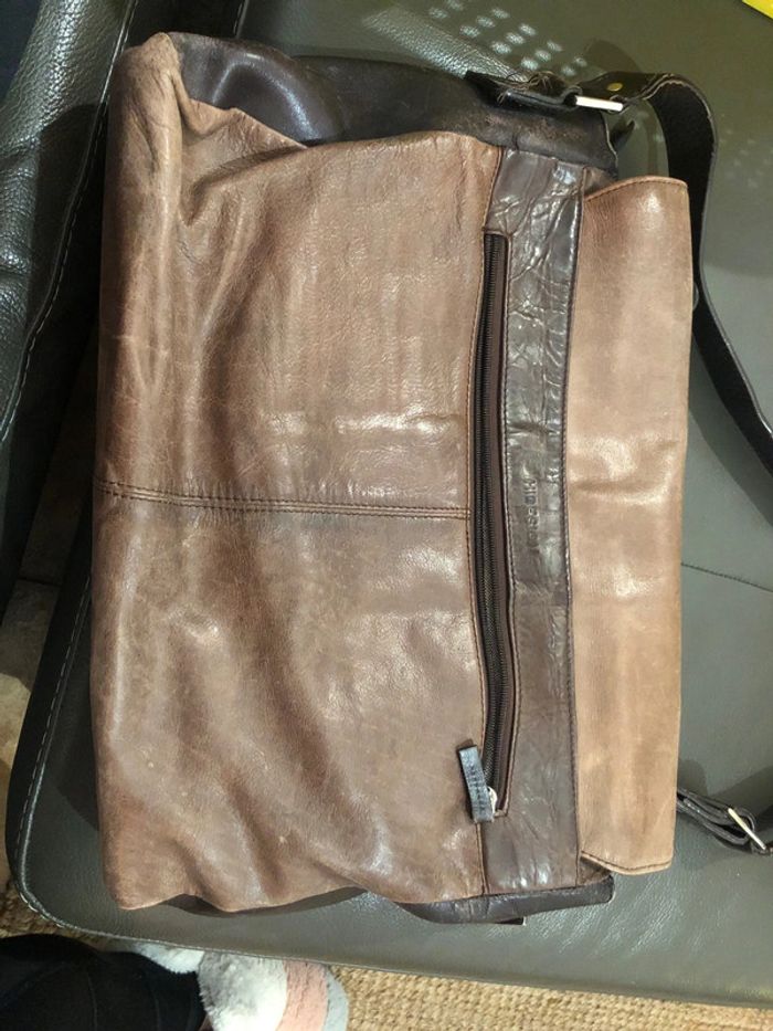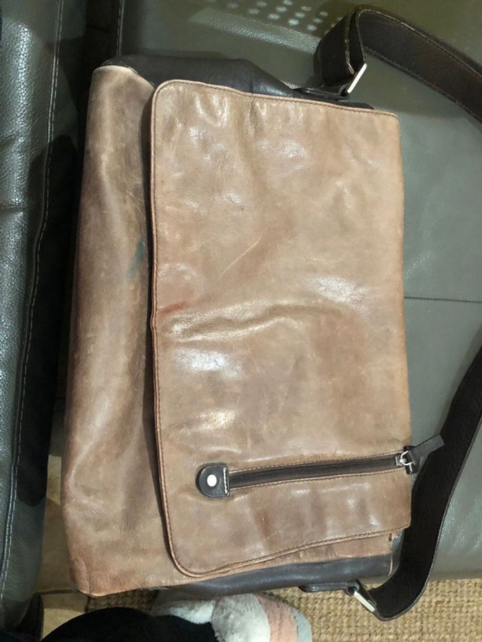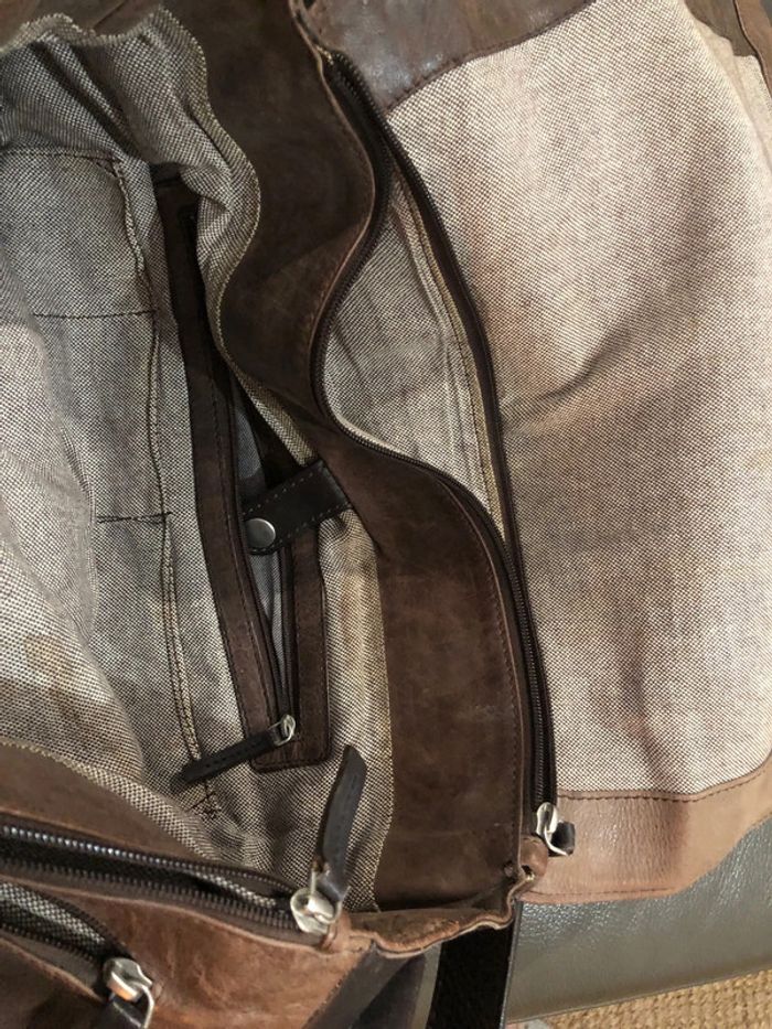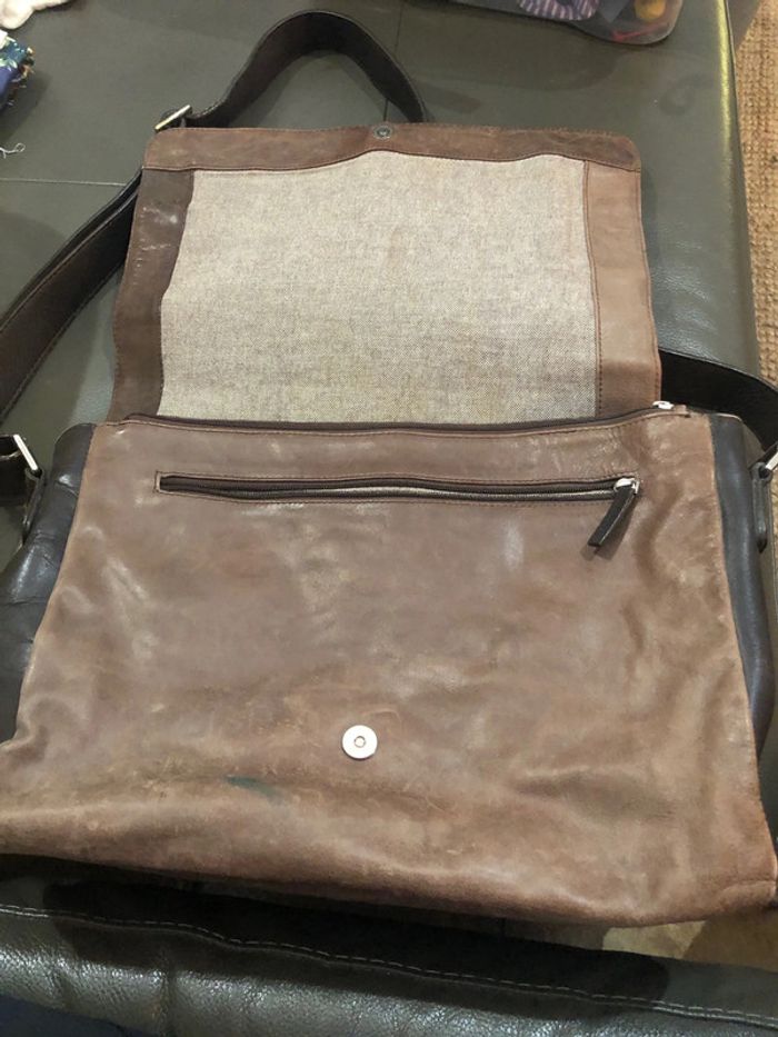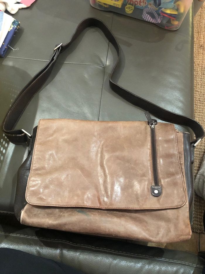 En bon état (joli patine, avec quelques défauts: une tache bleue devant, côté légèrement décousu mais encore très solide) Très nombreuses poches Très belle fabrication, artisanale Marron clair et marron foncé Largeur 39 cm Hauteur de la poche principal 27 cm Profondeur 11 cm Pensez à faire des lots pour bénéficier de réductions