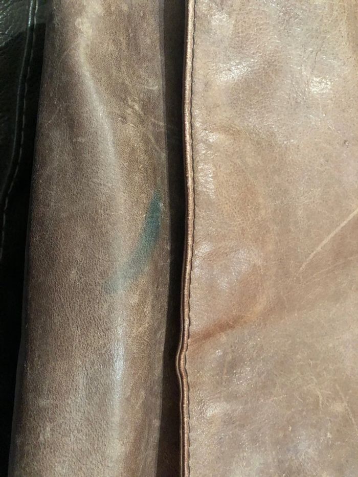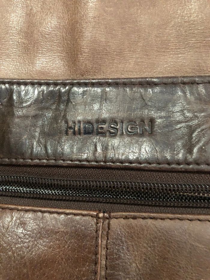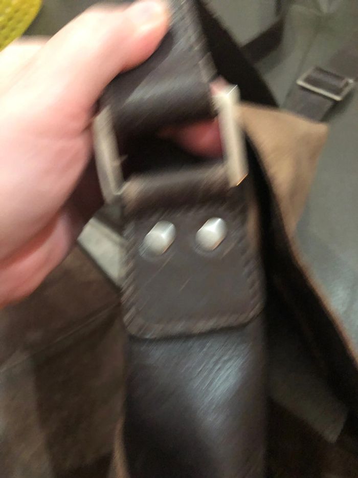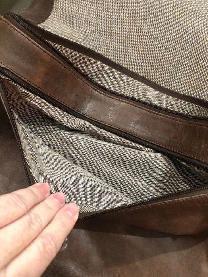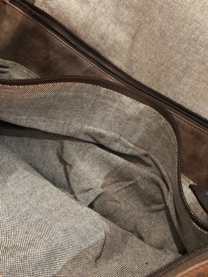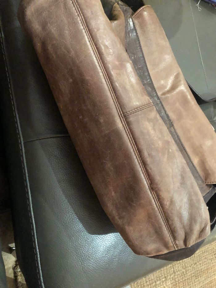 En bon état (joli patine, avec quelques défauts: une tache bleue devant, côté légèrement décousu mais encore très solide) Très nombreuses poches Très belle fabrication, artisanale Marron clair et marron foncé Largeur 39 cm Hauteur de la poche principal 27 cm Profondeur 11 cm Pensez à faire des lots pour bénéficier de réductions