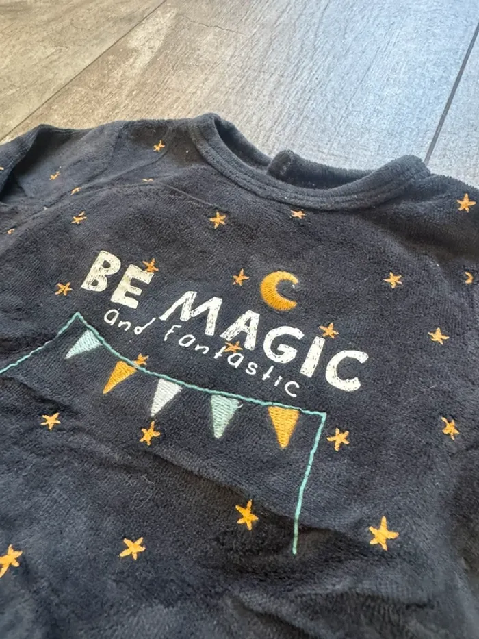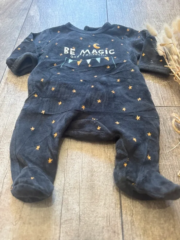☀️Pyjama une pièce bleu marine motif étoile « be magic and fantastic » Tout doux ❤️ ☀️Marque kiabi Taille 1 mois 52/55cm Maison non fumeur Envoi rapide