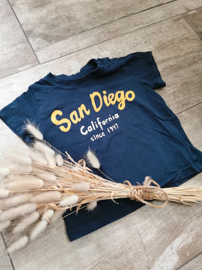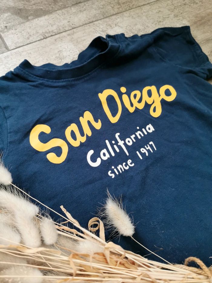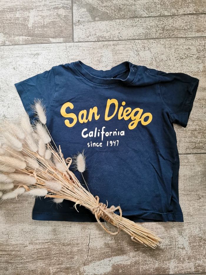 🌸Tee-shirt HetM Inscription logote sandiego California zince 1947 Taille 9mois Couleur bleu marine jaune moutarde #tapealoeil #tao #garçon #bebe #enfant #obaibi #teeshirt9mois #teeshirt #okaidi #hetm #bleu #california #surf #baby #kids #boy