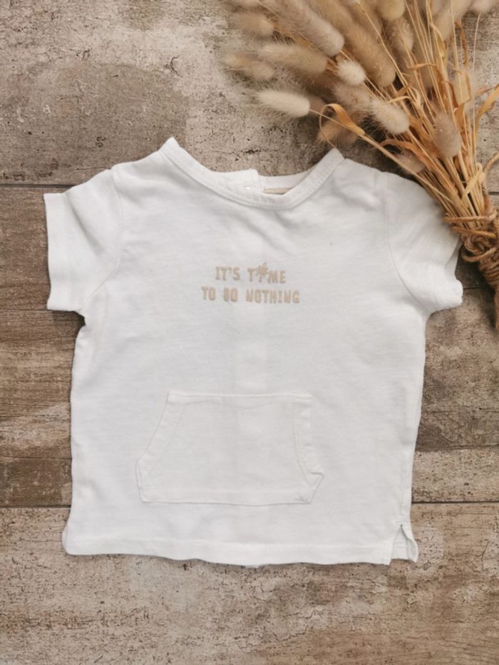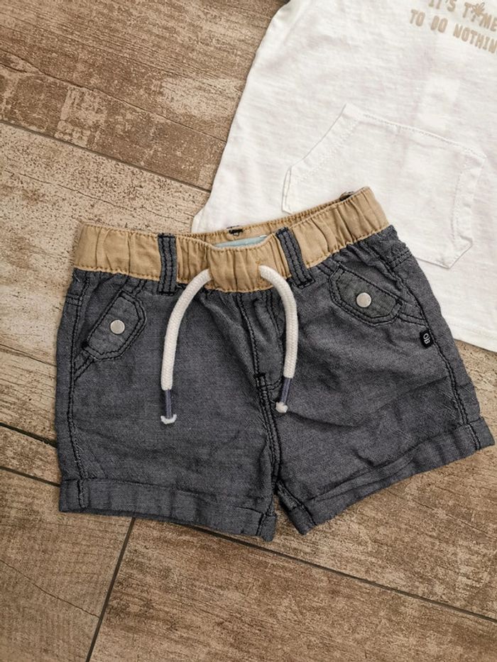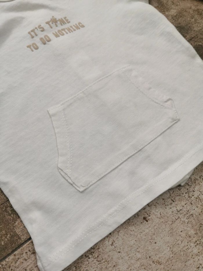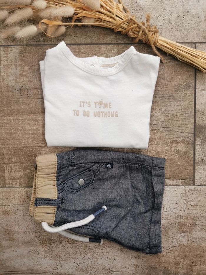 Parfait état❤️6mois 68cm Joli Ensemble comprenant : 🌺1 teeshirt Kiabi 6mois blanc petite poche devant. Bouton pression a l'arrière Inscription "It's time to do nothing" 🌺1 short effet jean souple couleur bleu et beige marron Obaibi 6mois. Petit cordon à la taille Réglable #obaibi #tapealoeil #ensemblebebe6mois #teeshirt6mois #short6mois #6mois