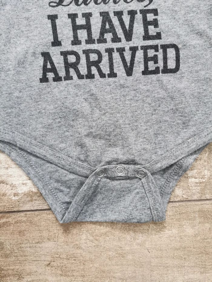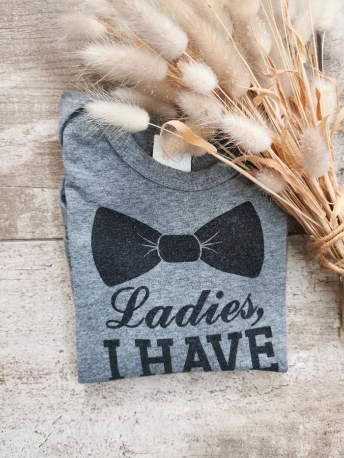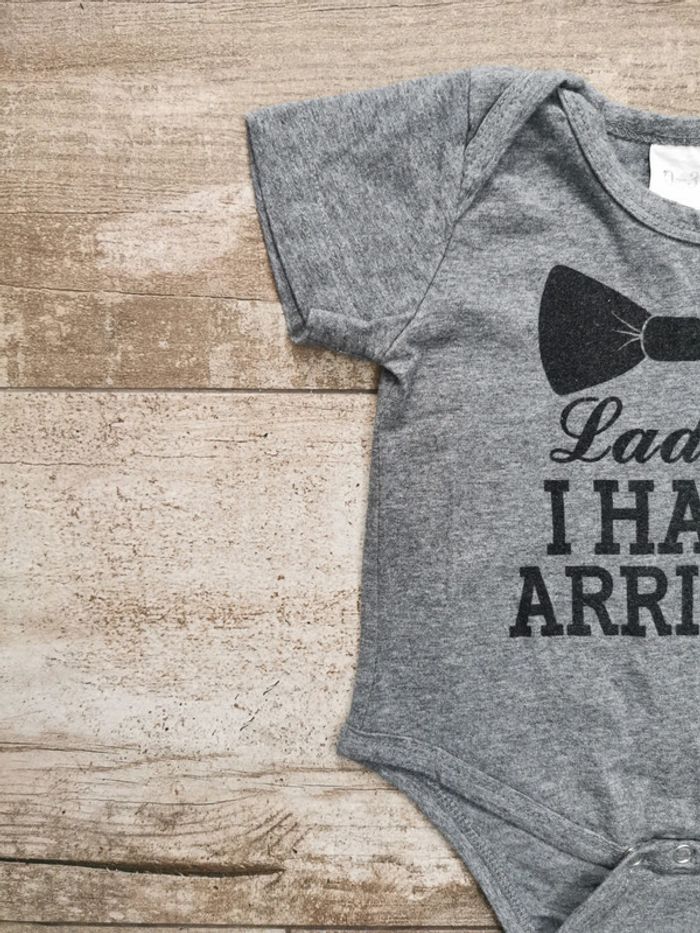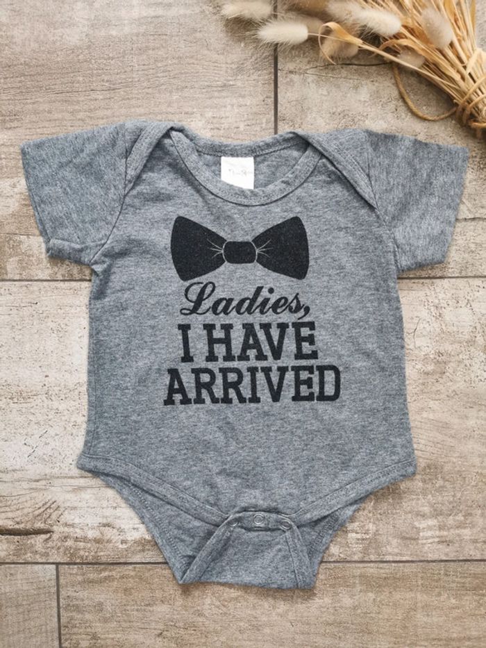 🌺Joli Bodie bébé garçon Comme neuf. Lave pour la vente. Porte une fois car pas la bonne saison Couleur gris et noir 🌺manche courte Taille 3mois 🌺Inscription " Ladies I Have arrived " Motif nœud papillon