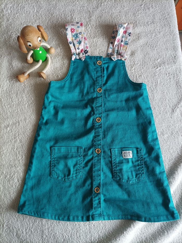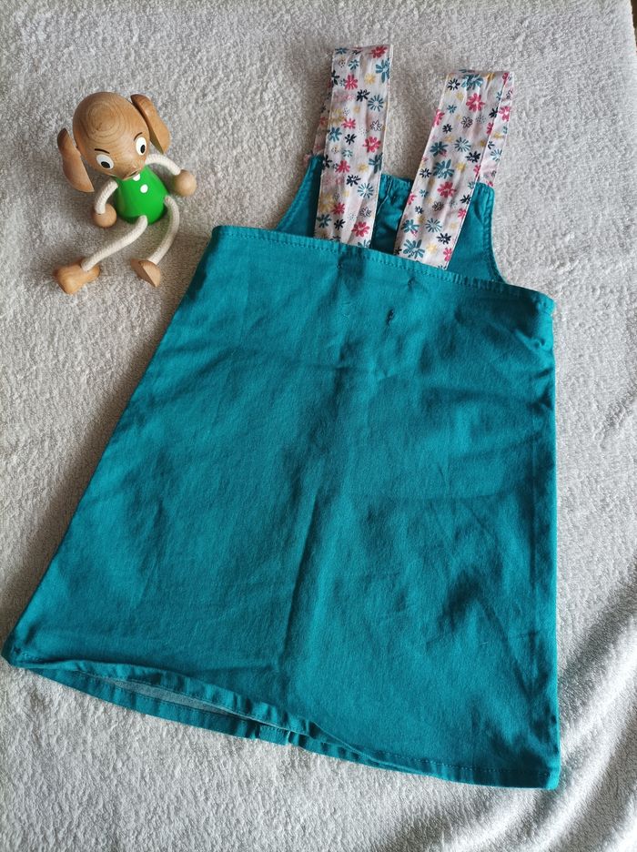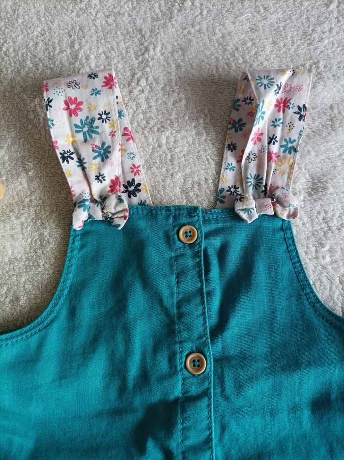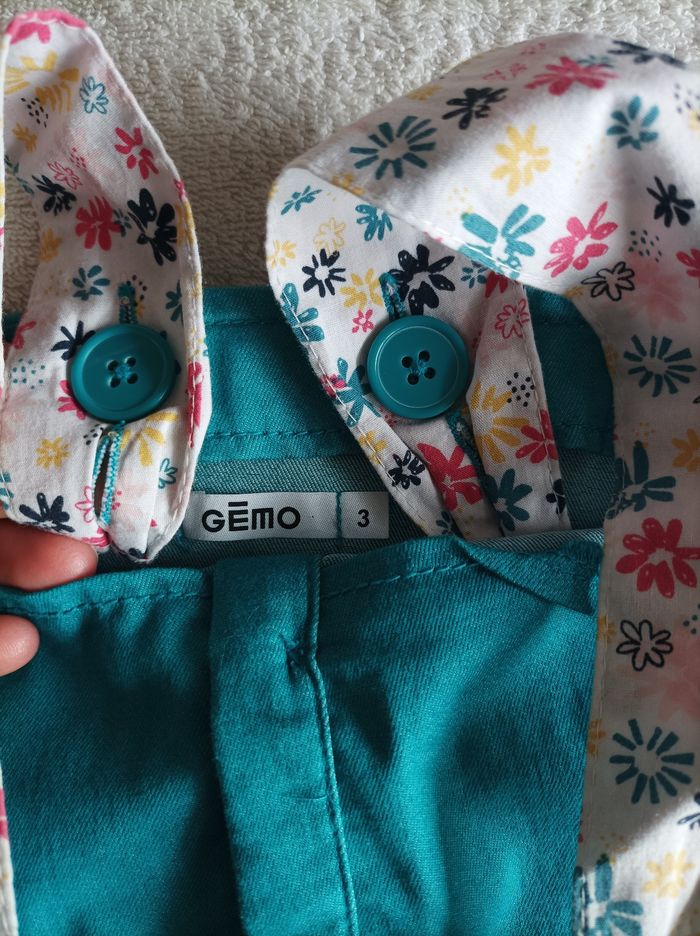 Robe salopette vert turquoise avec bretelles à fleurs réglages par boutons. Boutonnée entièrement devant. En parfait état. Gilet rose violet vendu avec. Fermeture par pression. 1 petit accro devant voir photo. Gémo, taille 3 ans. Pleins d'autres articles dans mon dressing avec des réductions par lots activées. Tout n'est pas en ligne donc n'hésitez pas à me solliciter.