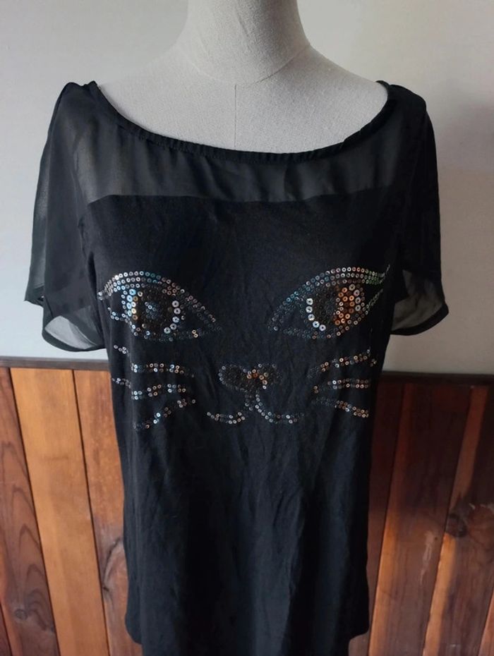 Tee-shirt noir avec des perles en forme de chat epaule voile #bakecotaille40femme