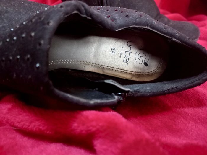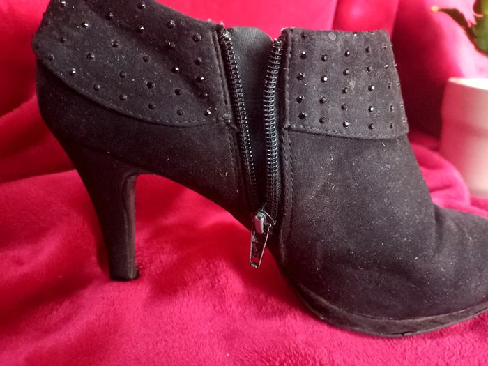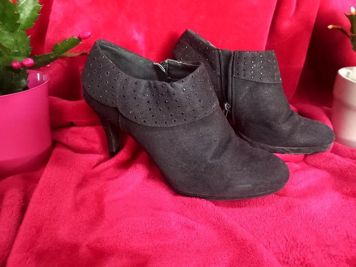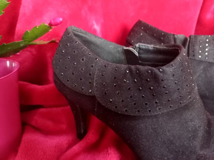 Bottine base noire , manque qq petit strass. Petit point abîmé sur le devant voir photo. Pointure 39 #bakecochaussure
