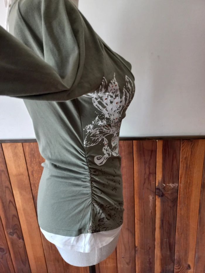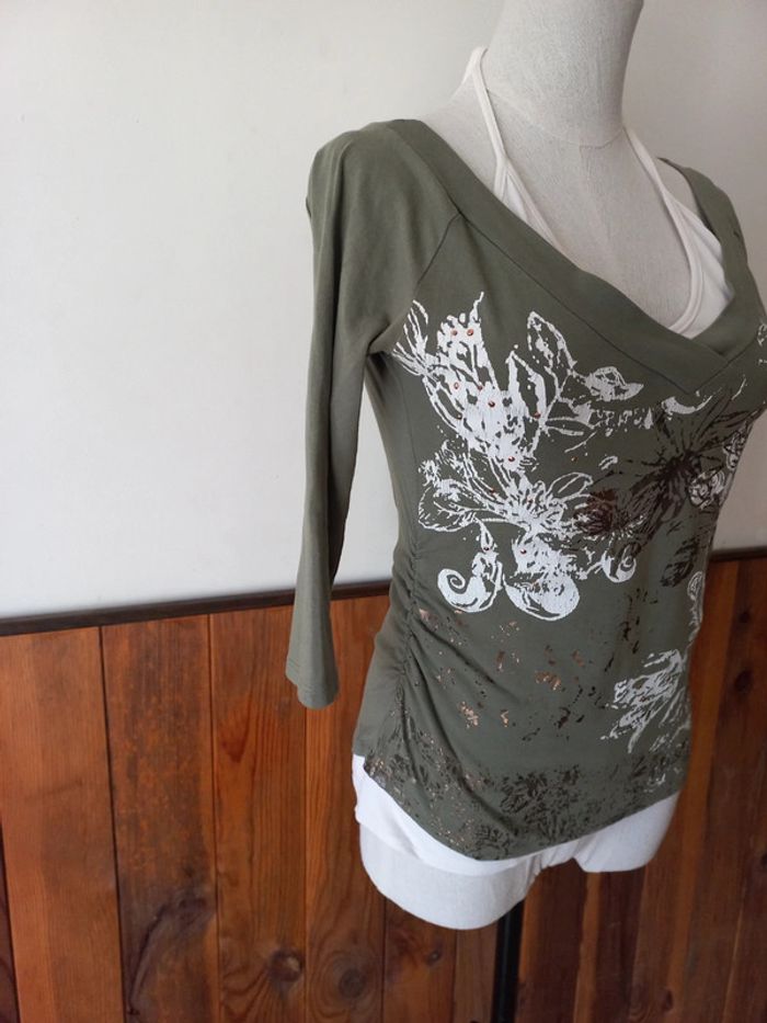 Haut kaki avec une doublure au niveau de la poitrine, froncé sur le côté. L'étiquette n'est plus mais c est un 36 . #bakecotaille36femme