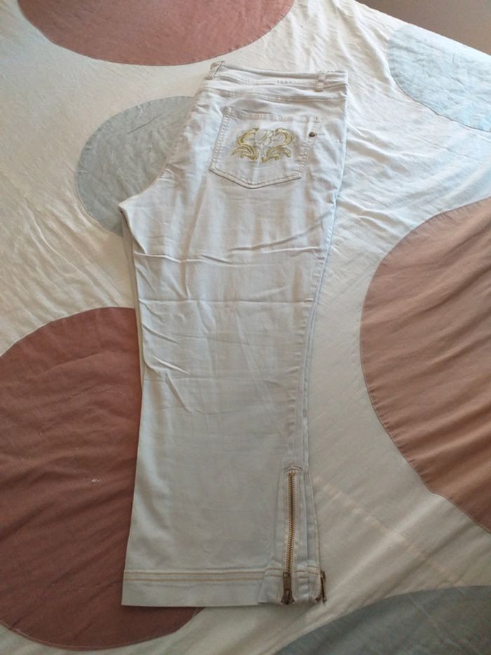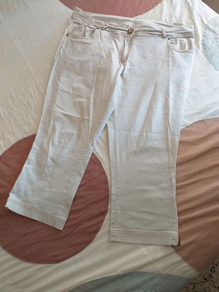 Pantacourt crème avec fermeture éclair en bas décor doré sur une des poche , il y a une petite tache à peine visible voir photo et il faut renforcer la couture à l entre jambe voir photo , T48 elasthanne. #bakecotaille48femme