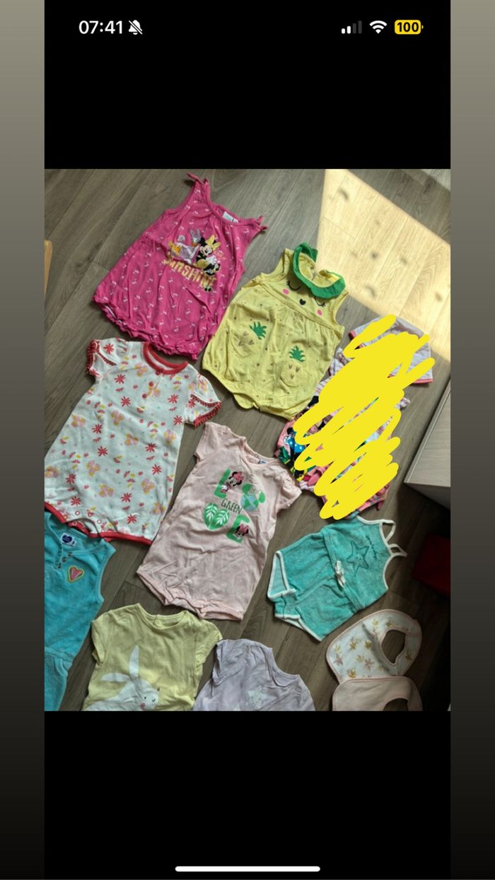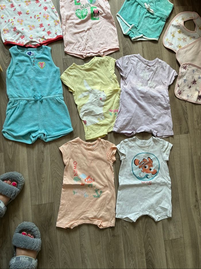 11 barboteuses ( 4 Disney, 2 TEX, 2 en éponge GEmo et mot d’enfants et 2 DPAM), 2 robes ( 2 gemo), 1 ensemble mots d’enfants haut et legging, 1 legging orchestra, 1 short lulu castagnette, 1 corsaire orchestra, 1 pantalon inextenso, 4t shirt (1 manches longues (marinière) 3 sans manche (disney, orchestra et mots d’enfants)), 1 bodie manche longue avec bandeau à pois et pantalon assorti, 1 pyjama Disney, 1 brassière mots d’enfants, 3 bavoirs