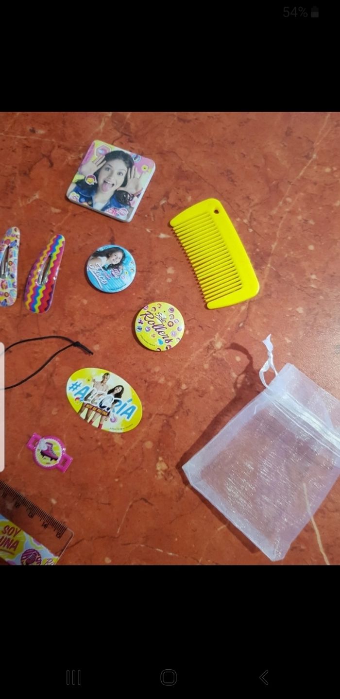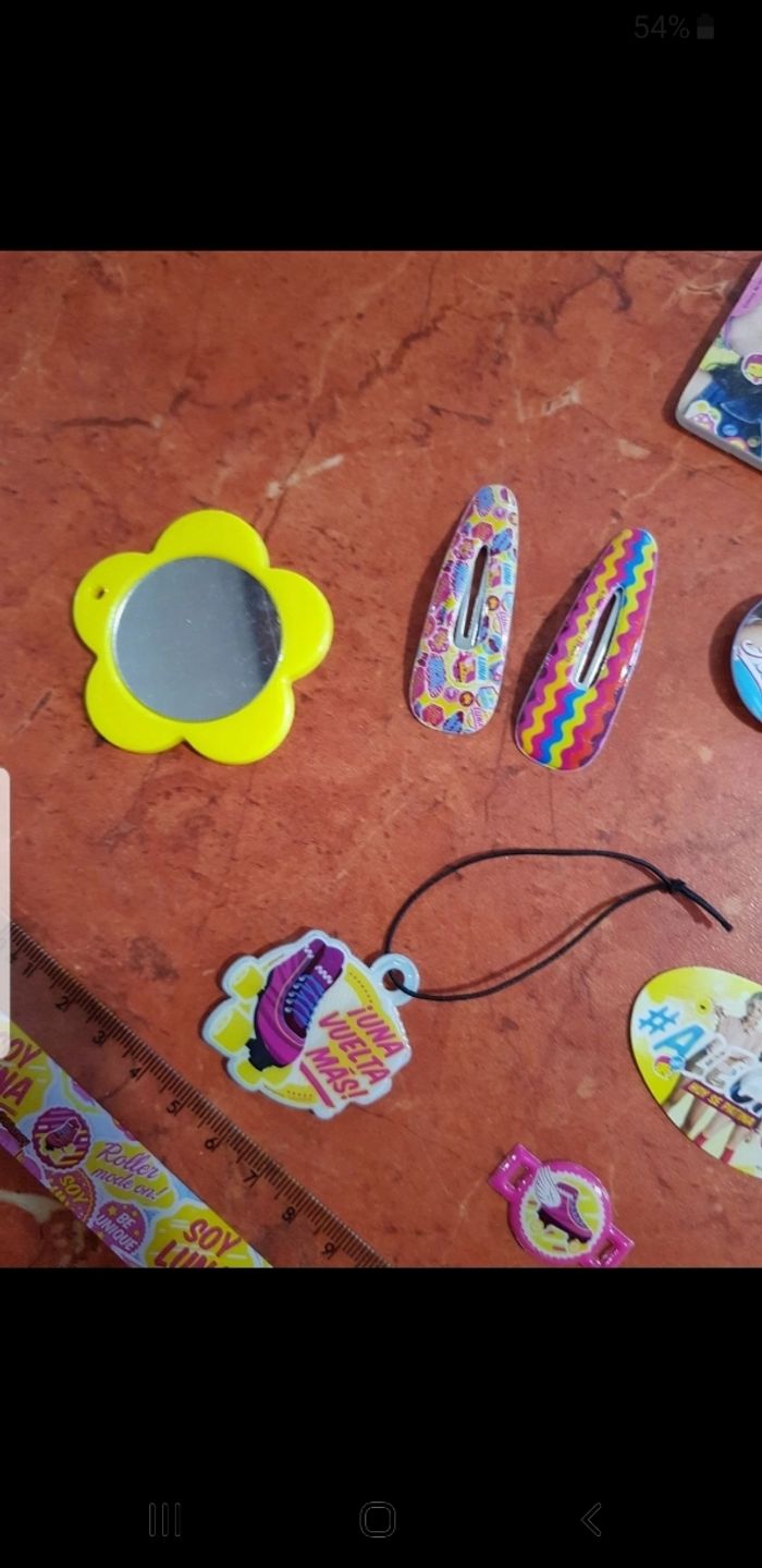 Ensemble comprenant 1 peigne, 1 miroir, 2 barrettes, 1 lime à ongle, 2 badges, un autocollant, 1 règle, 1 charms, avec 1 pochoir pour tout ranger