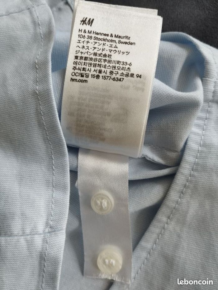 Chemisier H&M, à minuscules rayures Bleu ciel et blanc, cintré, encolure V et le reste boutonnée, Longueur 65cm. Très belle coupe, beau rendu ! intérieur des manches et col couleur blanc. Aisselle à Aisselle 53cm. Coton/Polyamide/Elasthanne.