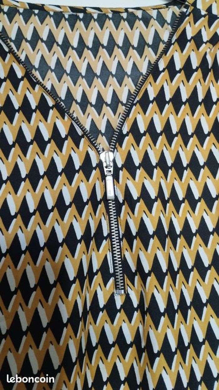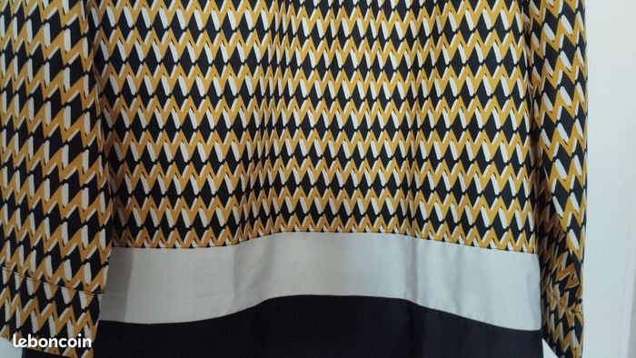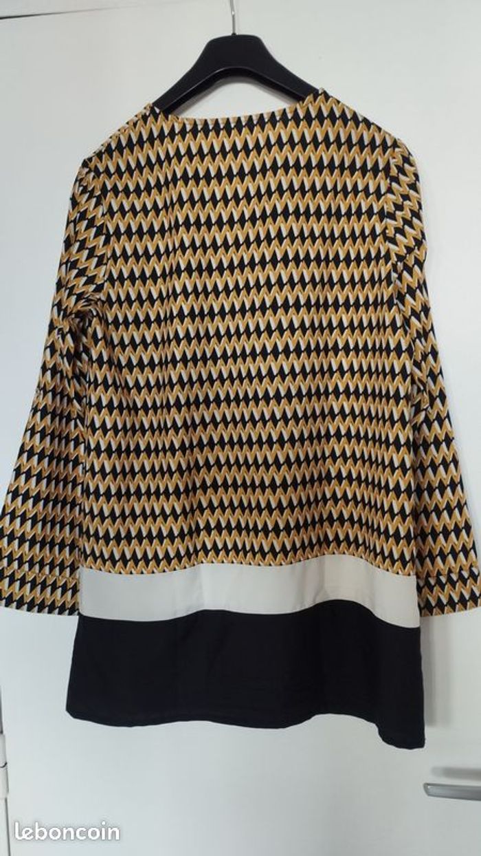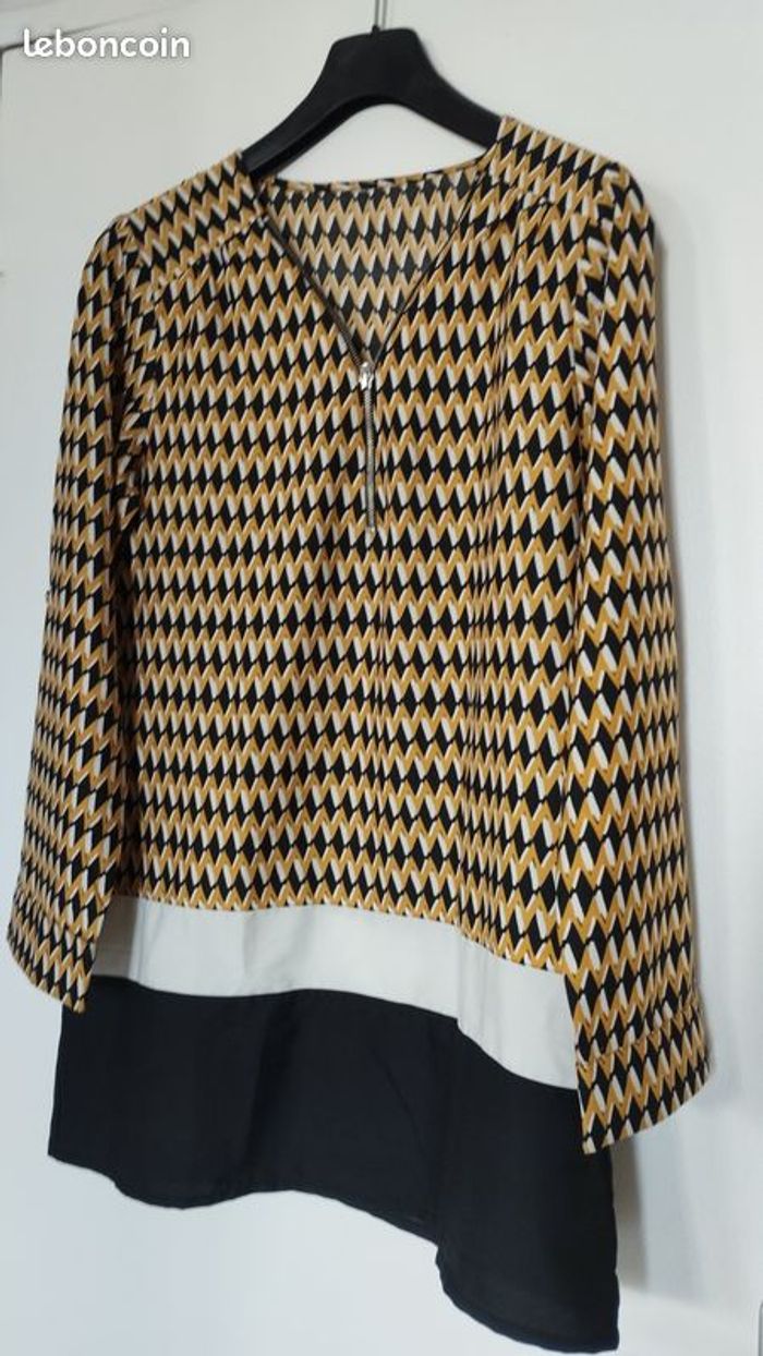 Long chemisier tunique, légère très agréable à porter, fermeture zip à l'encolure à vous de voir si décolleté ou pas ! Très peu porté. Couleurs miel, noir et blanc. Longueur 70cm