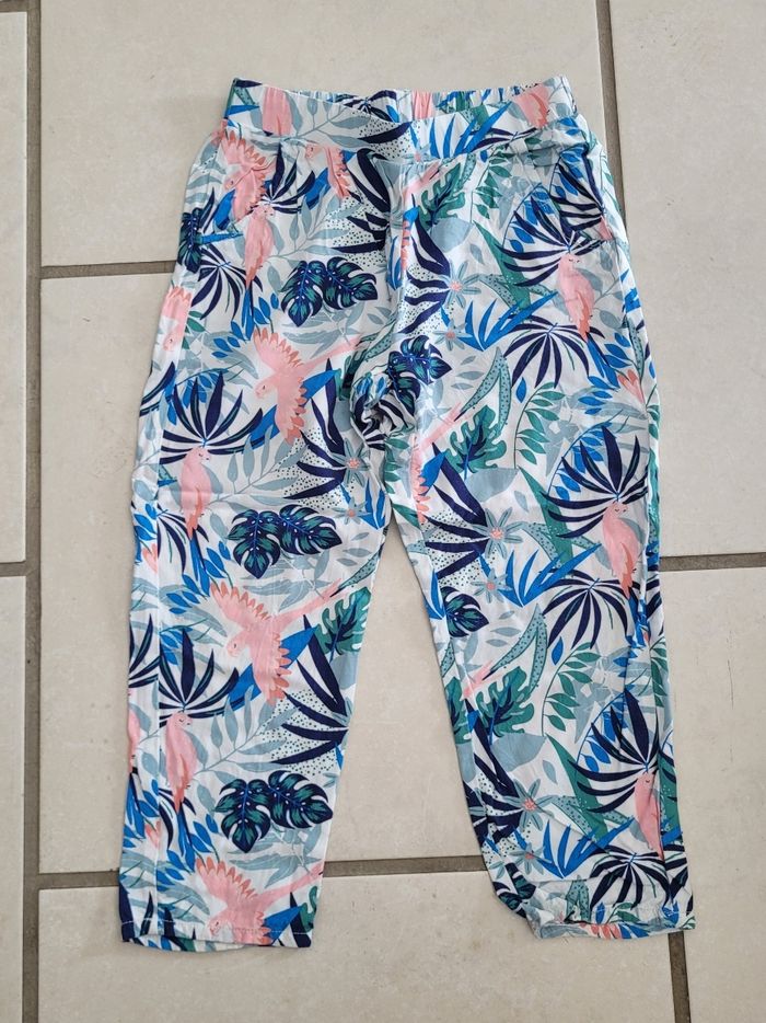Pantalon fluide de couleur blanc avec motif coloré, de la marque Gémo, taille 5 ans, en très bon état Article lavé pour la vente.