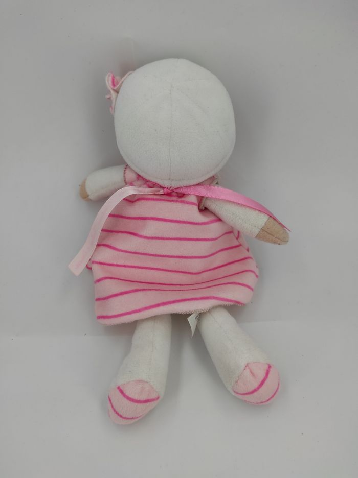Poupée facile a attraper, micro billes dans le popotin et les pieds, coeur rose brodé sur les chevilles.