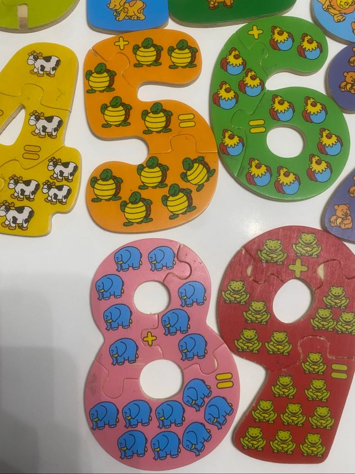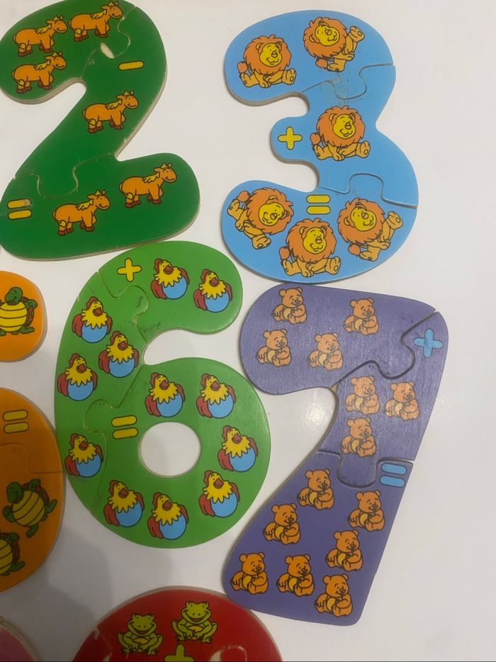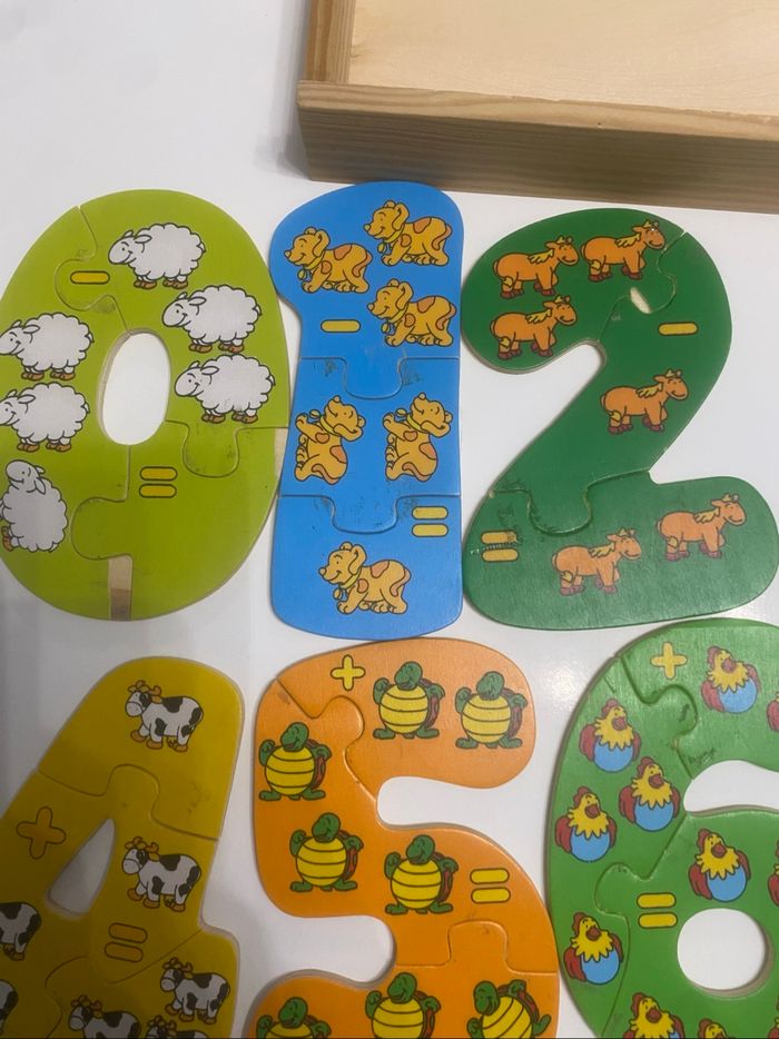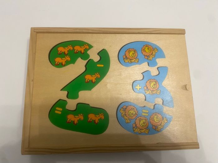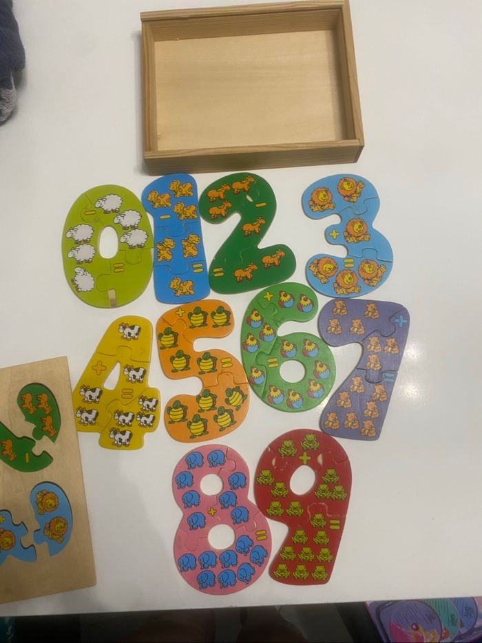 Chiffres en bois en forme de puzzle avec sa boîte de rangement. État satisfaisant ( petits éclats , voir photos) . 3€