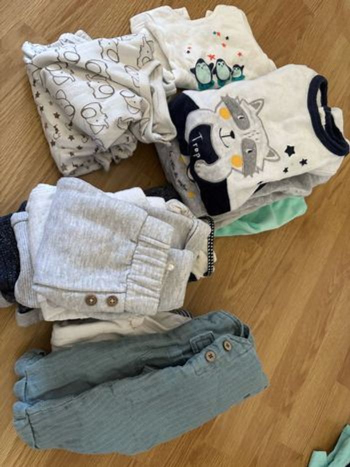 Vend lot de vêtements bébé 1 mois 3 bodies manches longues 1 pull fin 5 pantalons 3 salopettes 4 pyjamas velours 1 manteau 1 gilet en laine vert pale 1 gilet en laine jaune 1 gilet blanc 1 combinaison Plusieurs marques, orchestra, Gémo, obaidi, pommettes