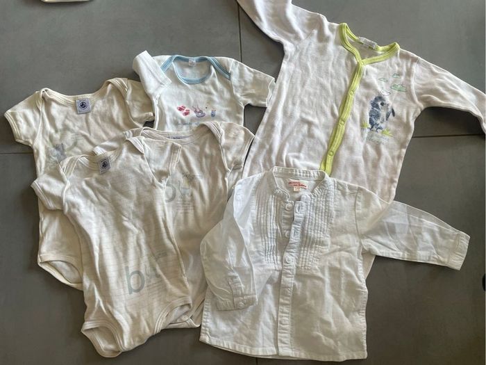 Très bon état 3 bodys petit bateau 1 body sans marque 1 grenouillère Kimadi 1 chemise blanche DPAM (léger accroc sur le bas) Taille 9 mois