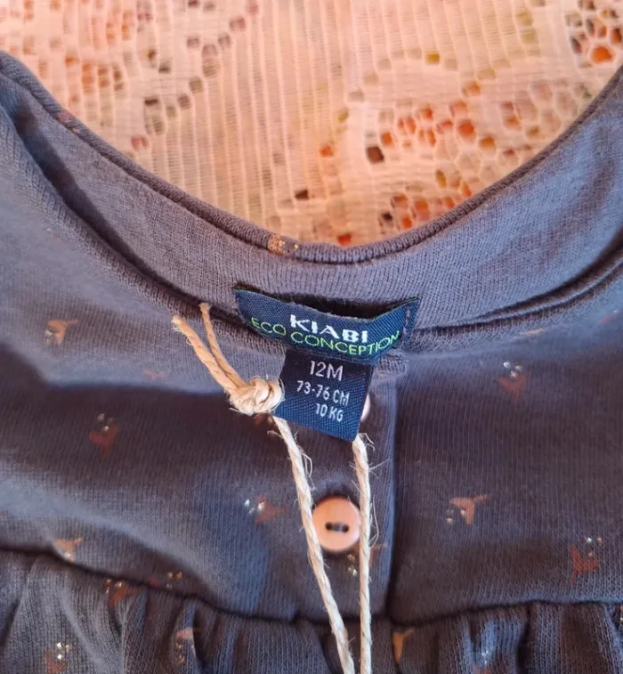 Adorable petite robe pour bébé fille de la marque KIABI – Éco conception, taille 12 mois (73-76 cm / 10 kg). Coloris gris foncé avec petits motifs discrets et jolis boutons bois sur le devant. Manches longues, tissu doux et confortable. 🆕 Neuve avec étiquette. Idéale pour l’automne ou les journées fraîches. Maison non fumeur – Envoi rapide et soigné. #kiabi #robebébé #12mois #bébéfille #neuve #écoresponsable #automnebébé #vêtementbébé #kidstyle