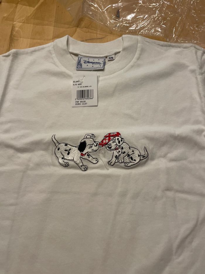 TEE Shirt Disneyland Paris neuf avec étiquette Taille 6 8 ans 101 dalmatiens ⚠️ une petite tache (d’encre ?) visible sur l’avant dernière photo, partira sans doute au lavage mais je préfère prévenir !