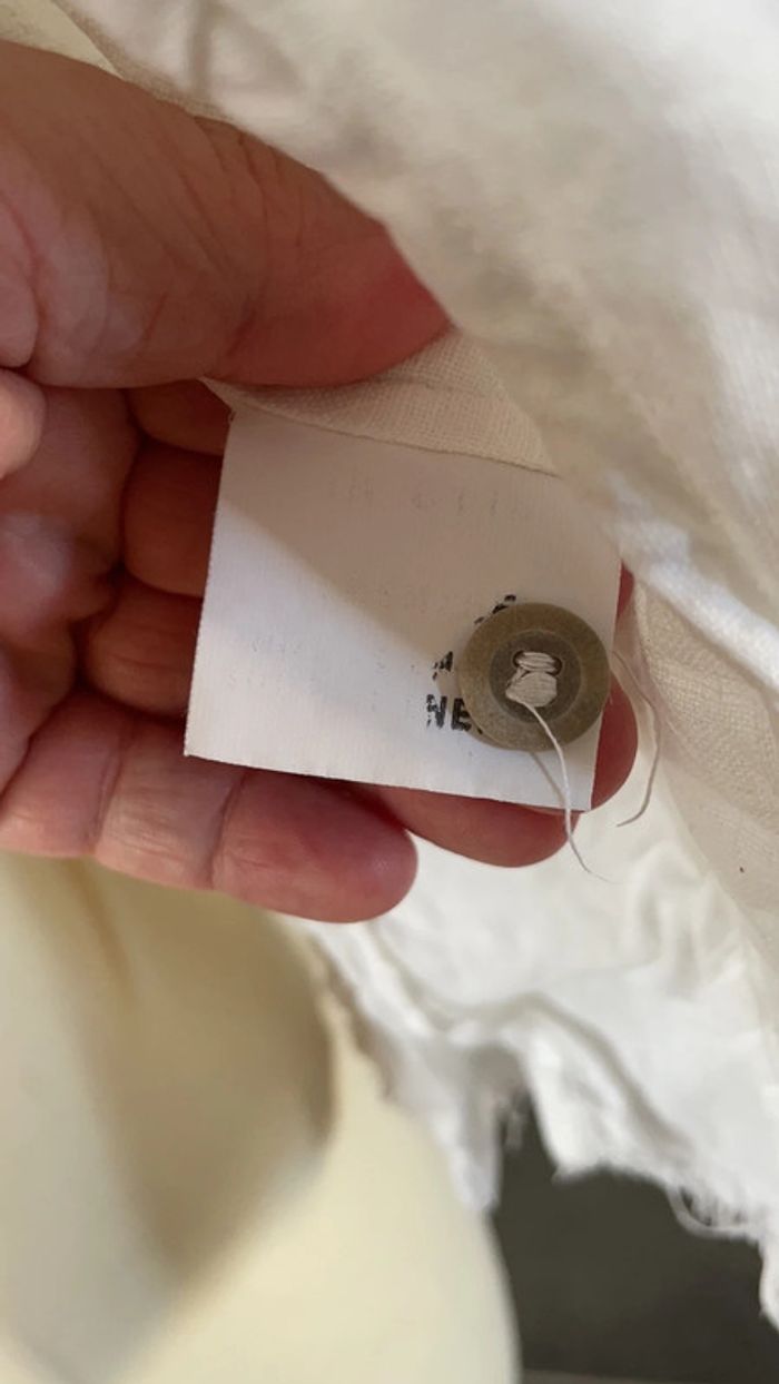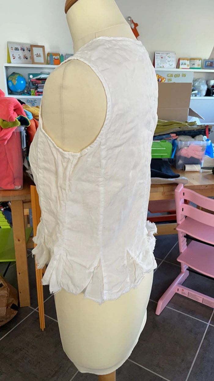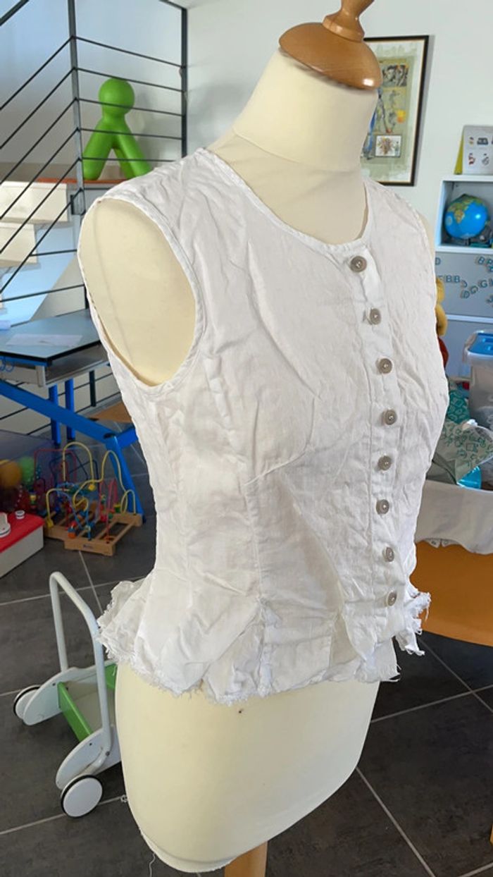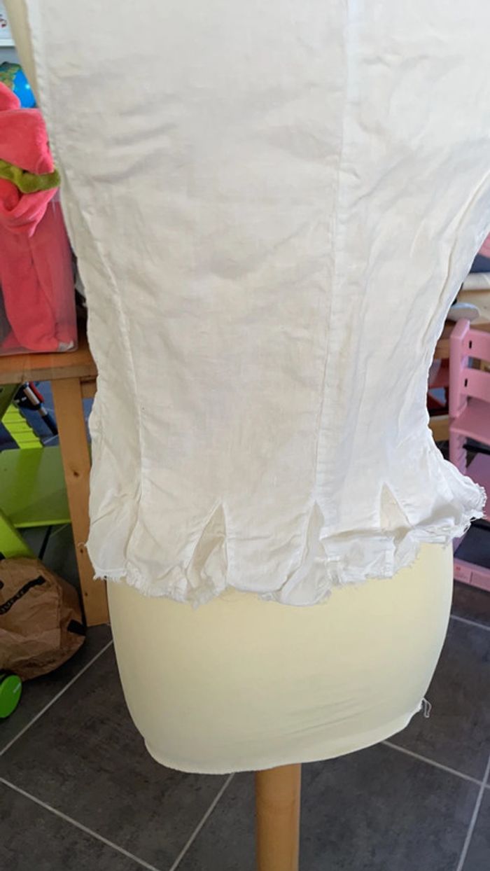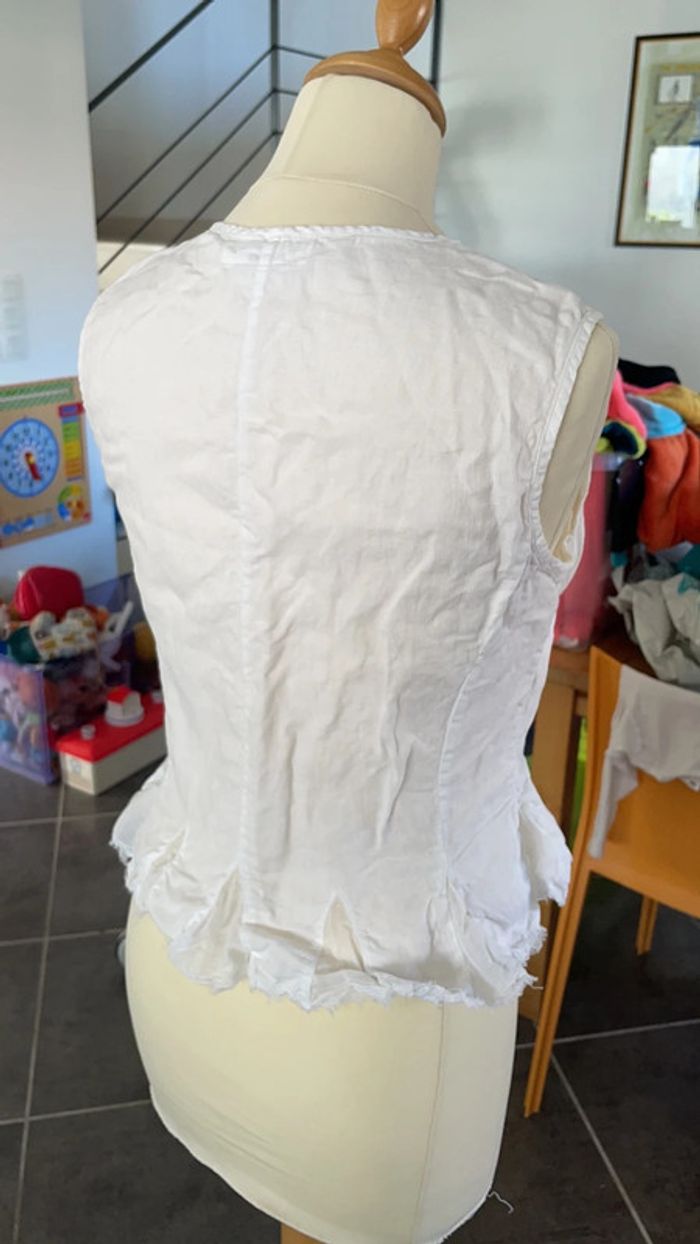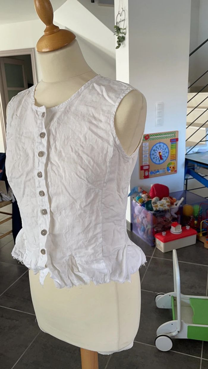 Chemise blanche taille 38 100% lin À la fois chic et légère Originale grâce aux détails du bas (effet effiloché ) Excellent état car très peu portée Un petit coup de fer à repasser lui ferait du bien 😉