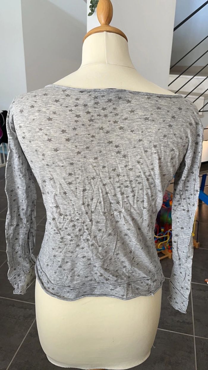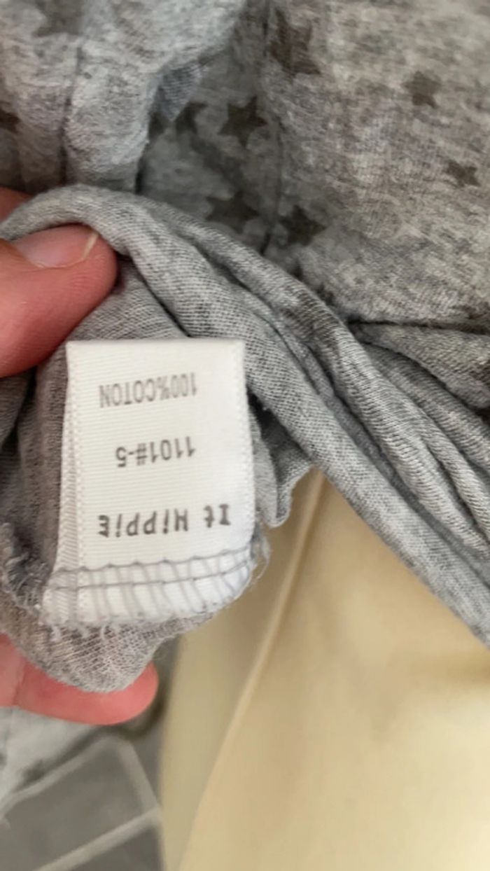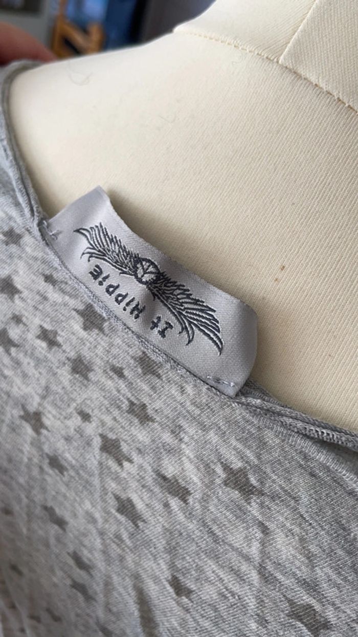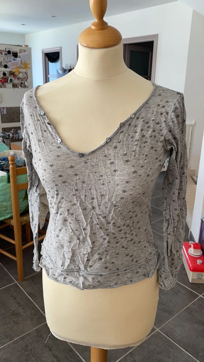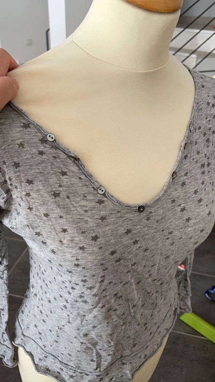 Joli haut léger gris avec des étoiles It hippie Porté mais encore en bon état Jolie encolure ronde avec des boutons Mon mannequin taille du 38