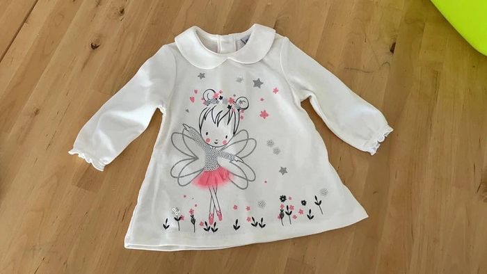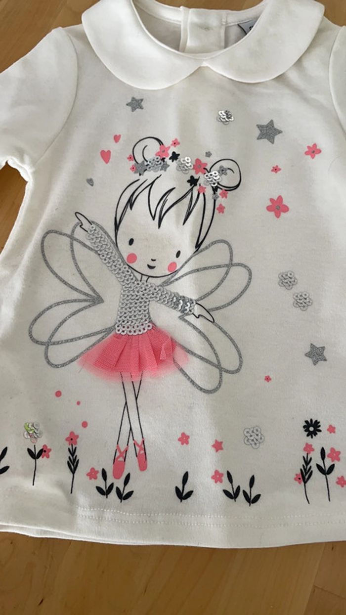 Jolie petite robe à sequins paillettes et tulle représentant une fée danseuse Robe courte style tunique Boutons à l’arrière pour faciliter l’enfilage Neuf jamais porté Taille 6 mois