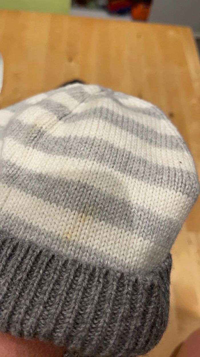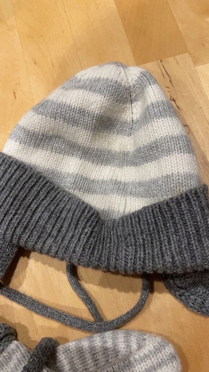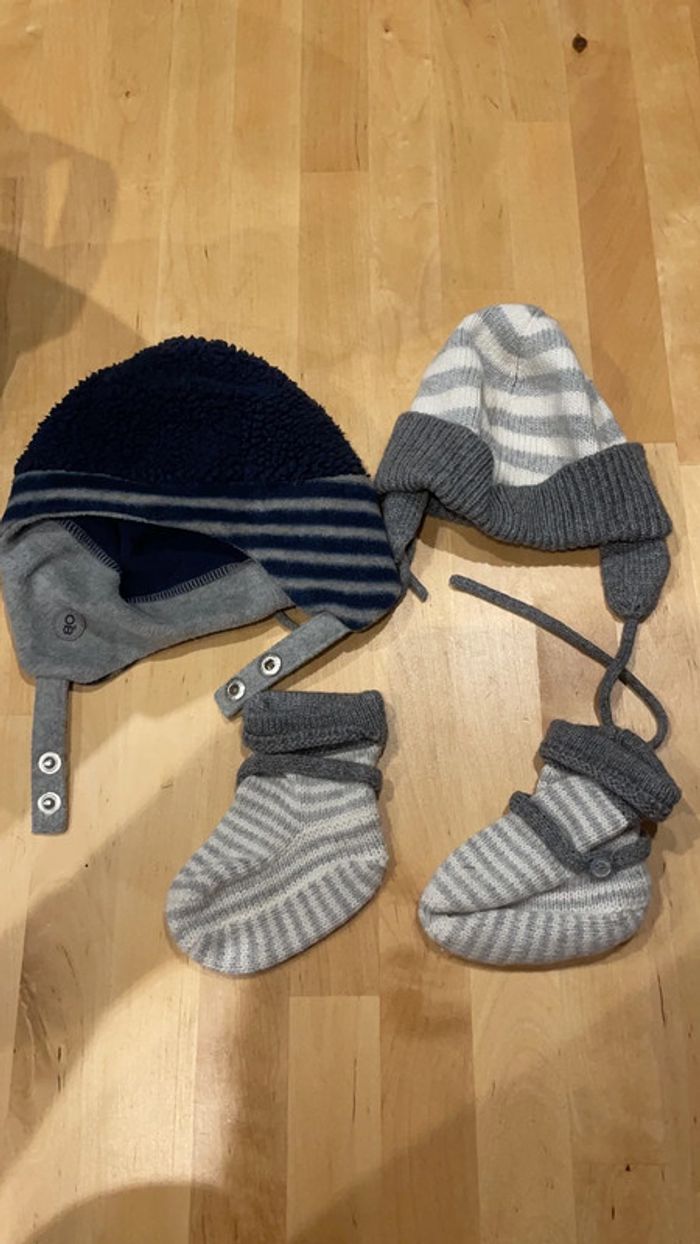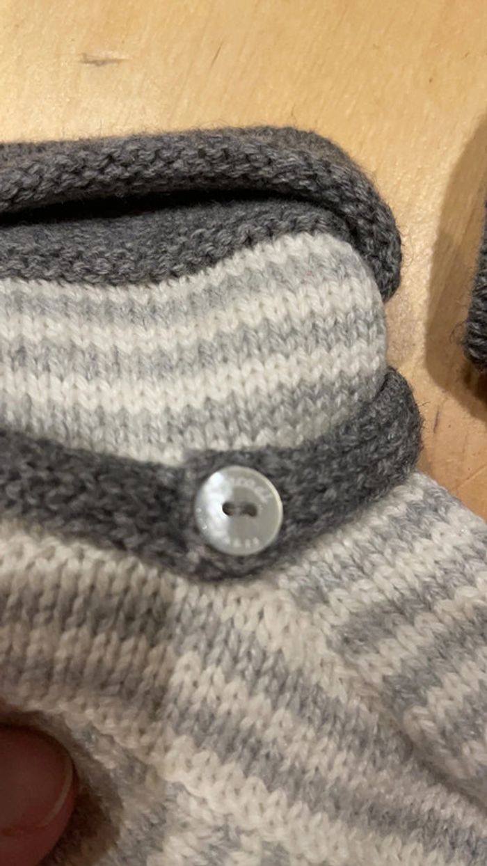 Une paire de bottons bébé taille 18/19 de marque jacadi et coton laine polyamide alpaga rayés gris et blancs assortis au bonnet de la même marque taille 41 pour tenir la tête et les pieds de bébé au chaud. A noter qu’il y a des taches peu visibles sur le bonnet (dernières photos, traces légèrement jaunes) Je mets avec un bonnet plus grand réversible Obaïbi tout doux en polaire